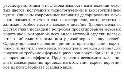 В учебном пособии показан весь спектр современных направлений в меховой отделке одежды из различных материалов. Представлены современные методы мехового дизайна, включая дизайн пушно-мехового полуфабриката. Описаны зарубежные и отечественные технологии меховых пластин и полотен для получения разнообразных видов меховой отделки одежды. Представлены способы изготовления отделочных элементов из целых шкурок и отходов скорняжного производства, а также технологии мехового дизайна текстильных материалов. Отдельная глава посвящена вопросам проектирования меховых воротников.