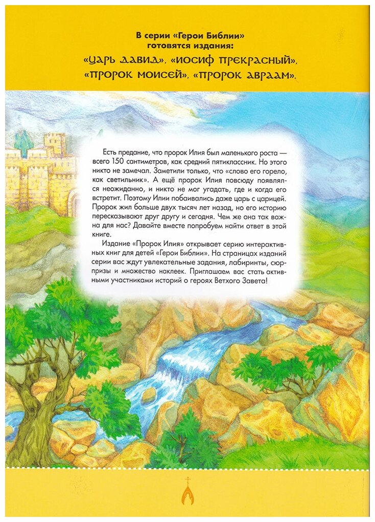 .Настоящее красочно иллюстрированное издание открывает серию интерактивных книг для детей «Герои Библии». На его страницах маленьких читателей ждет не только пересказ жития пророка Илии, но и увлекательные задания, лабиринты, сюрпризы и множество наклеек.