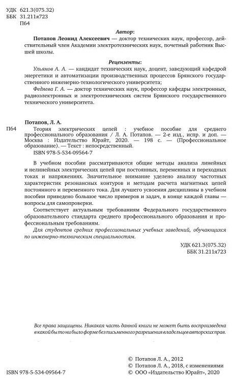 Теория электрических цепей. Учебное пособие для СПО (Потапов Леонид Алексеевич); ЮРАЙТ, 2019