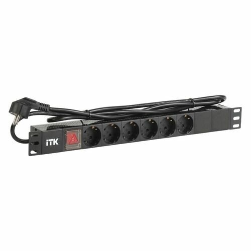 ITK PDU 6 розеток немецкий стандарт с выключателем, 1U, кабель 2м, вилка немецкий стандарт ПВХ, черный.Горизонтальные 19” PDU от ITK прекрасно справляются с задачей по электроснабжению сетевого оборудования в шкафах и стойках, а также с требованием защиты от токов короткого замыкания и перенапряжения. Изготавливаются блоки розеток из высококачественных термостойких материалов и пластмасс, оснащаются в зависимости от модели выключателем со светоиндикацией, автоматом УЗО, кнопкой сброса при перенапряжении и соответствуют российским и международным стандартам качества. Горизонтальные PDU соответствуют стандарту 19” (482,6 мм) и устанавливаются с помощью кронштейнов на 19” профиль, при этом положение кронштейнов можно менять.