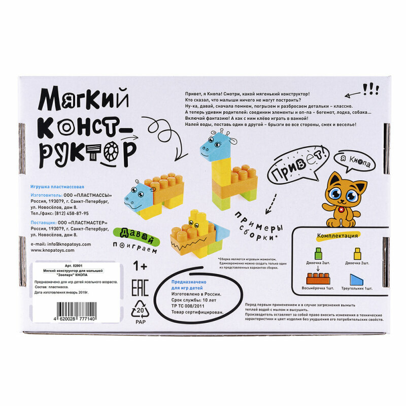 Конструктор для малышей "Зоопарк" выполнен из высококачественного мягкого и одновременно прочного материала. Крупные детали конструктора удобны для тренировки координации движений при составлении в единый объект и способствуют развитию сенсорики. Как и любой конструктор, он развивает воображение и образное мышление малышей. Детали конструктора абсолютно безопасны и привлекательны для малышей своими необычными свойствами: их можно сжимать, грызть, брать с собой купаться. Ими невозможно пораниться и нанести механические повреждения.
