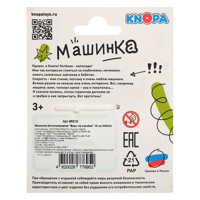 Игрушка Knopa, Машинка бетономешалка "Вжух на стройке" 10 см с мультяшным дизайном всегда «под рукой». Её удобно взять с собой на прогулку, в песочницу, в дорогу, на дачу. Безопасный материал полипропилен, из которого изготовлена