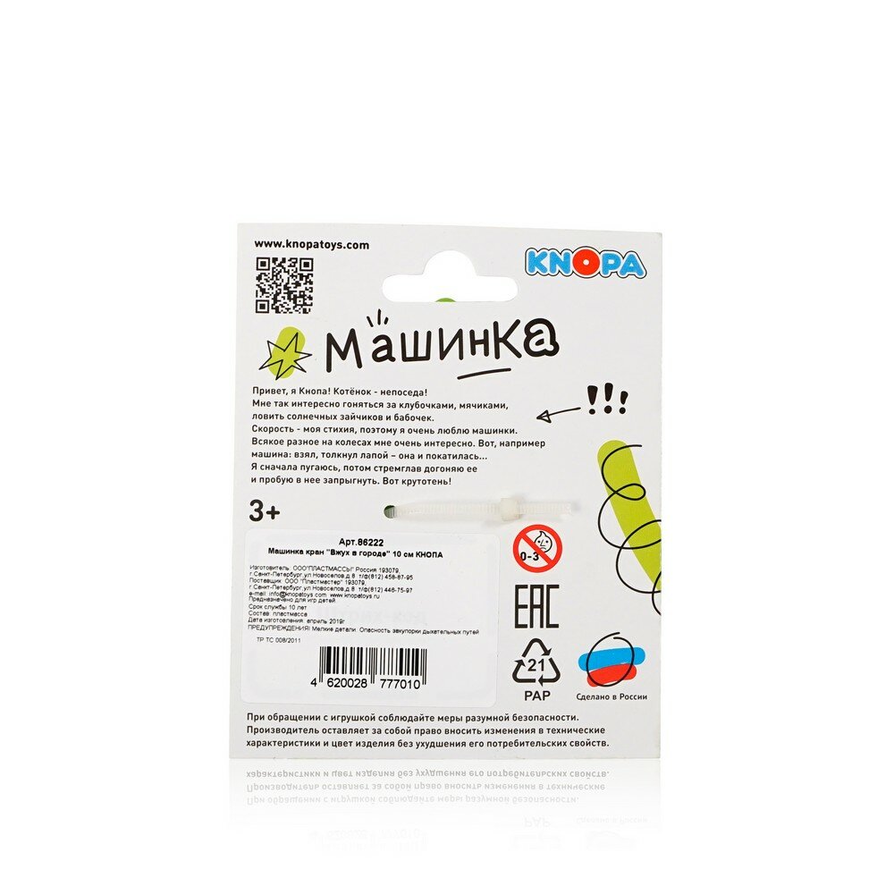 Игрушка Knopa, Машинка кран "Вжух в городе" с мультяшным дизайном всегда «под рукой». Её удобно взять с собой на прогулку, в песочницу, в дорогу, на дачу. Безопасный материал полипропилен, из которого изготовлена