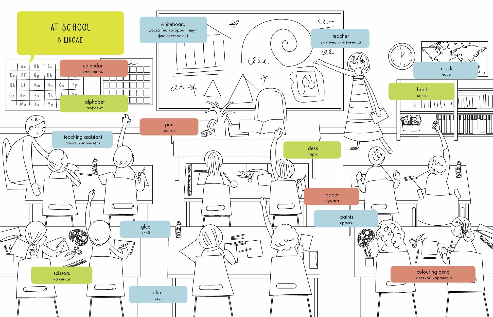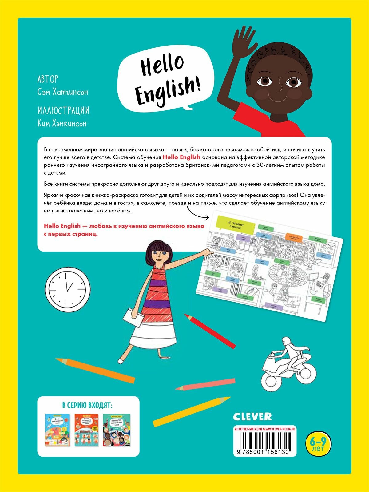 Hello English! Я рисую и запоминаю английские слова. Книжка-раскраска (Сэм Хатчинсон); Clever, 2019