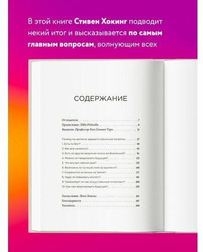 Перед вами последняя книга всемирно известного физика Стивена Хокинга, книга-завещание, в которой он подводит некий итог и высказывается по самым главным вопросам, волнующим всех. Выживет ли человечество? Должны ли мы так активно внедряться в космос? Есть ли Бог? Это лишь некоторые из вопросов, на которые отвечает Стивен Хокинг, один из величайших умов в истории, в своей финальной книге. В книгу включены предисловие оскароносца Эдди Редмэйна, игравшего Стивена Хокинга, введение Нобелевского лауреата Кипа Торна и послесловие дочери Хокинга, Люси,
