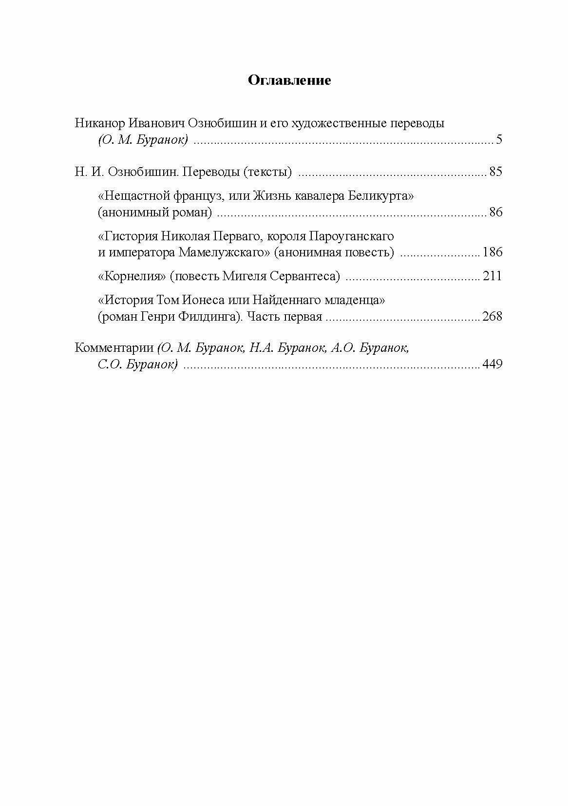Книга посвящена творчеству русского литератора, переводчика середины XVIII века Никанора Ивановича Ознобишина и является расширенным и переработанным переизданием: Буранок О. М. Никанор Ознобишин и русская переводная художественная проза середины XVIII века. Самара, 2010. В настоящем издании содержатся четыре перевода с французского языка различных произведений - романов, "гистории" и повести, а также исследование о них, комментарии к ним.