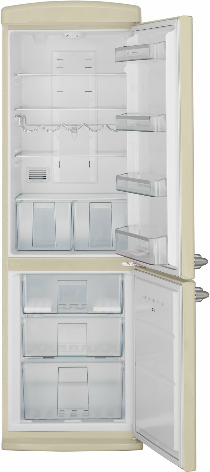 Schaub Lorenz SLUS335С2 – элегантный вместительный холодильник с корпусом бежевого цвета, дизайн которого выдержан в стиле ретро. Это двухкамерная модель с нижним расположением морозильной камеры. Холодильник оснащен производительным компрессором, который поддерживает температуру в обоих отделениях на заданном уровне и работает с низким уровнем шума. Установить необходимую температуру можно с помощью несложной механической системы управления. Размораживание холодильника производится автоматически.