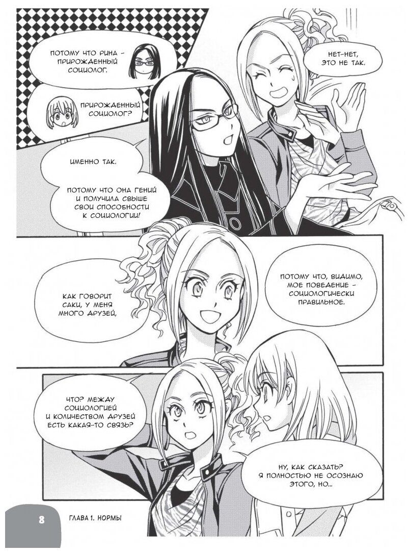 Хорошая выдалась манга, достойное пополнение образовательной серии. В манге рассматриваются основные определения социологии как науки и даются их английские аналоги (за что большое спасибо редакторам, редко такое оставляют при переводе). Есть несколько вариантов чтения конкретно этого тома: можно читать лишь рисованные части с основными, но полностью изложенными тезисами, или текстовый в конце каждой главы, или сначала собственно мангу, а затем закреплять текстом. Манга не перегружена событиями, хотя сюжет и есть, к сожалению просматривается пиксельность графики. И сама книга не розовая, а вполне себе красная как и остальные.