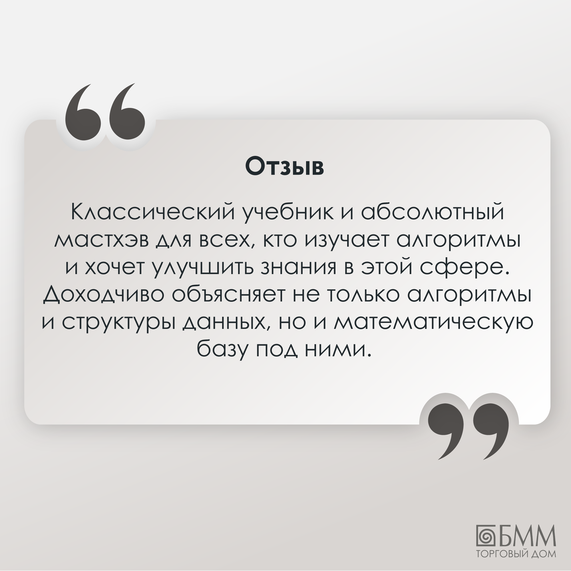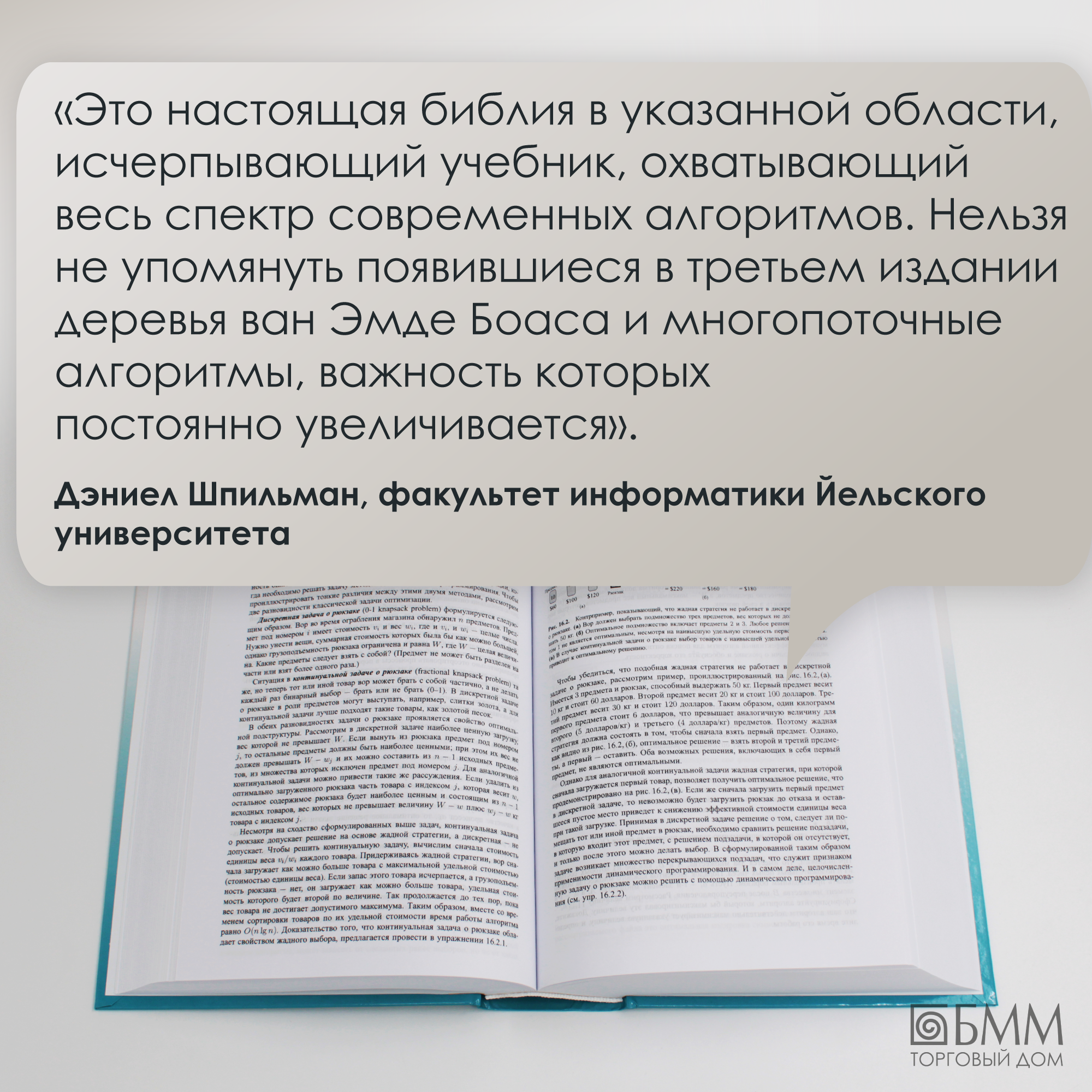 "Это настоящая библия в указанной области, исчерпывающий учебник, охватывающий весь спектр современных алгоритмов: от быстрых алгоритмов и структур данных до алгоритмов с полиномиальным временем работы для решения очень сложных задач, от классических алгоритмов теории графов до специализированных алгоритмов поиска подстрок, вычислительной геометрии и теории чисел. Нельзя не упомянуть появившиеся в третьем издании деревья ван Эмде Боаса и многопоточные алгоритмы, важность которых постоянно увеличивается".