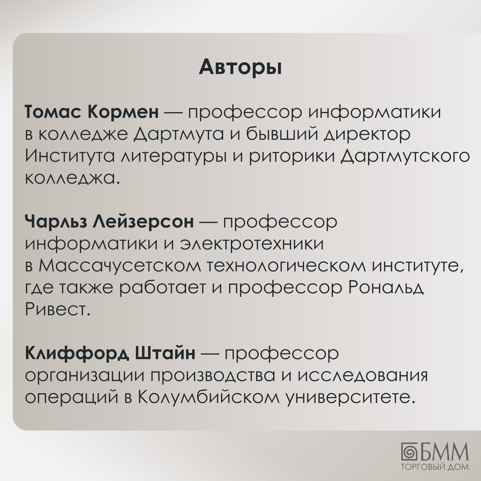 Томас Кормен - профессор информатики в колледже Дартмута и бывший директор Института литературы и риторики Дартмутского колледжа. Чарльз Лейзерсон - профессор информатики и электротехники в Массачусетском технологическом институте, где также работает и профессор Рональд Ривест. Клиффорд Штайн - профессор организации производства и исследования операций в Колумбийском университете.
