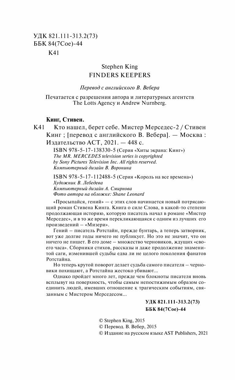Произведение написано в лучших традициях Стивена Кинга. Его отличительной чертой является то, что он очень часто делает отсылки на сюжеты или героев других своих романов, и "Кто нашёл, берёт себе" тому подтверждение. Это произведение было опубликовано в 2015 году, оно довольно свежее. А я считаю, что результат творческой работы автора, как хорошее вино, с годами становится только лучше. Итог такой: книга понравилась, к качеству печати претензий нет. Рад, что полка с другими шедеврами Короля Ужасов пополнилась ещё одним экземпляром. Поклонникам автора однозначно советую приобрести и прочитать!
