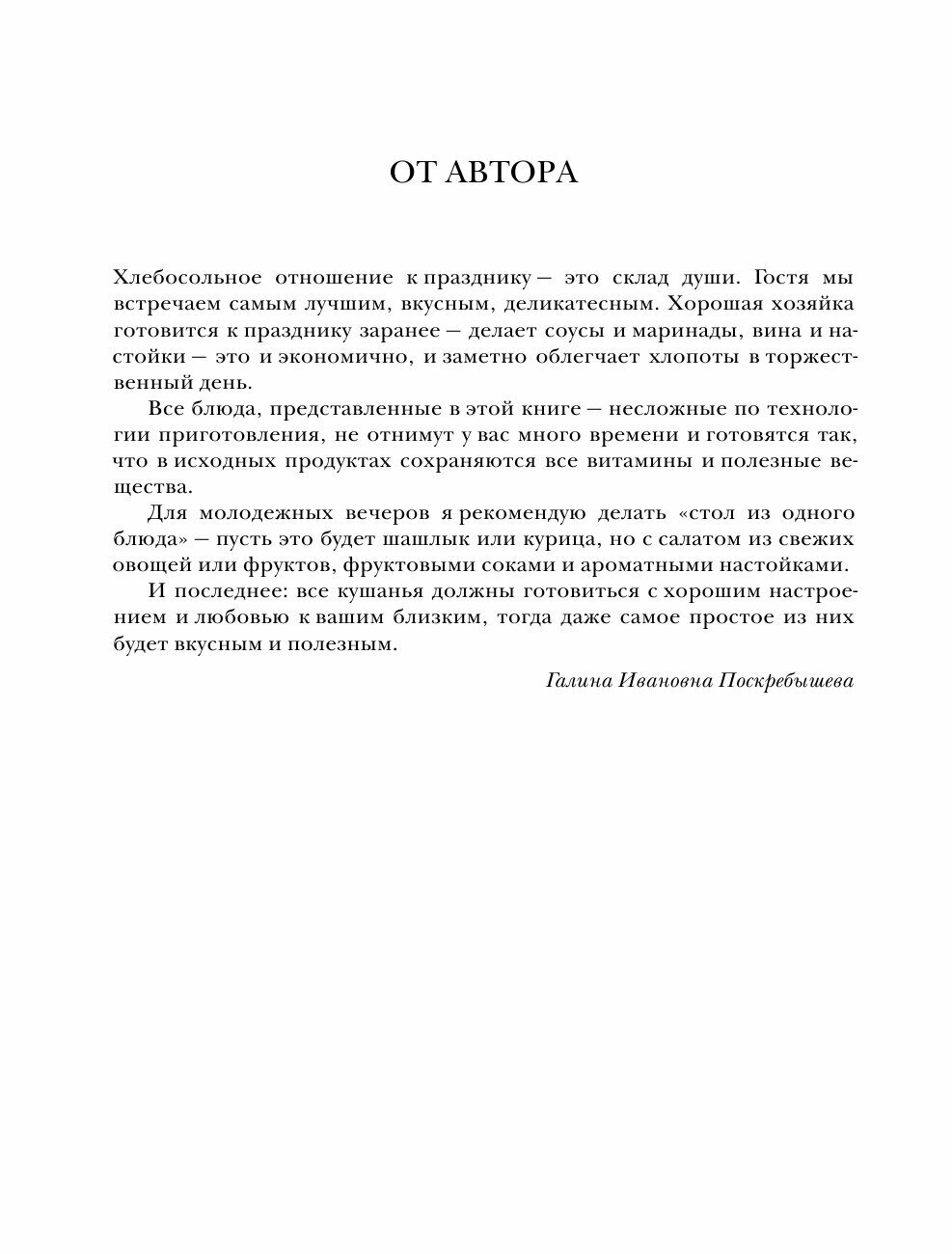Уникальное издание "Энциклопедия праздничных блюд", собравшее лучшие рецепты известного кулинарного мастера Галины Ивановны Поскребышевой, члена Московской ассоциации кулинаров, обладательницы серебряной медали ВДНХ, автора популярных книг, - настоящий бестселлер. Много лет проработав в практической медицине, более 35 из них Галина Ивановна посвятила изучению и совершенствованию народных рецептов кулинарии.