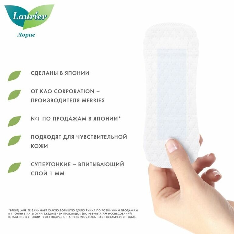 Мягкие и супертонкие ежедневные японские прокладки с ионами серебра Laurier Beauty Style с ароматом луговых трав (Лорие бьюти стайл, Лауриер), 2 капли — идеальное средство личной гигиены для женщин на каждый день. Обеспечивают ощущения чистоты, свежести и нежной заботы в течение всего дня. В состав впитывающего слоя прокладок на каждый день входят ионы серебра, которые способствуют предотвращению размножения бактерий и устранению неприятного запаха. Супертонкие (толщина впитывающего слоя ~ 1 мм) ежедневки Laurier Beauty Style легко принимают форму нижнего белья, не скручиваются, не сминаются и не отклеиваются. С ними удобно заниматься спортом и вести активный образ жизни.Нежнейшая стёганная поверхность практически не ощутима на коже, не липнет и не вызывает раздражений. Воздухопроницаемый нижний слой прокладки не пропускает выделения, но превосходно выводит прелый воздух, обеспечивая максимальный комфорт и ощущение свежести.Каждая ежедневная прокладка Лорие выпускается в индивидуальной упаковке, которая занимает мало места в сумочке и позволяет сохранить гигиеничность и чистоту прокладки до момента использования. Её удобно захватить с собой на работу или оставить в тумбочке офиса. Женские гигиенические прокладки на каждый день Laurier Beauty Style с ионами серебра от производителя японских подгузников Merries (KAO Corporation) подходят для самой чувствительной и нежной кожи, в том числе в качестве ежедневных прокладок для девочек подростков. Одна флоу-упаковка Laurier Beauty Style содержит 62 прокладки и заменит Вам примерно 3 стандартные упаковки более дешёвых прокладок на каждый день. Длина каждой прокладки – 14 см. Со средствами личной гигиены для женщин Laurier (Лорие) Вы будете чувствовать себя свободной, защищённой и уверенной в любой день. Позаботьтесь о важном, а о Вас позаботится Laurier.