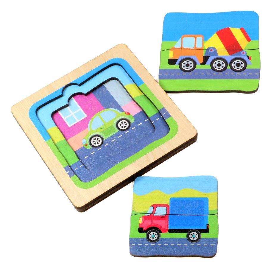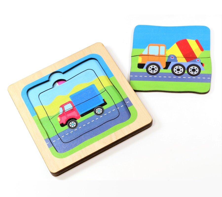 Трехслойные деревянные пазлы – это прежде всего головоломка для детей, начиная с 3 летнего возраста. В отличии от обычных пазлов, здесь, собираемые картинки расположены друг под другом.В трехслойных пазлах «Машинки» на самом нижнем слое изображен легковой автомобиль. Второй слой с грузовичком состоит из двух половинок, он укладывается поверх предыдущего. Третий слой с бетоновозом также состоит из двух половинок и укладывается поверх двух предыдущих.Играя в пазлы, ребенку предстоит найти и объяснить логическую взаимосвязь в расположении слоев с машинками.Состав игры:планшет, размер 120х120х12 мм,пазловые элементы 4 шт.Все детали игры выполнены из сертифицированной фанеры при помощи лазера, не имеют заусенцев и зазубрин. Картинки на фишках нанесены безопасными красками на водной основе, поэтому безопасны для детей.Предупреждение!1. Не давать детям младше 3 лет.2. Не хранить вблизи нагревательных приборов.3. Не играть вблизи открытого огня.4. Из-за наличия мелких деталей контроль со стороны взрослых обязателен.