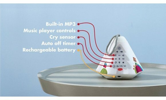 1 – кнопка включения2 – управление громкостью3 – включение белого шума (5 типов)4 – переключение на mp3 плеер5 – включение проекции (на стену)6 – micro USB разъём для зарядки и записи мелодий на внутреннюю память7 – таймер автоматического выключения (30 мин., 60 мин., бесконечный повтор)8 – сенсор плача (автоматическое включение)9 – включение ночника10 – выбор трека11 – включение встроенных мелодий (17 колыбельных)12 – ручка для переноски/Лампа может подвешиваться, ставиться на стол на любую плоскую сторону.