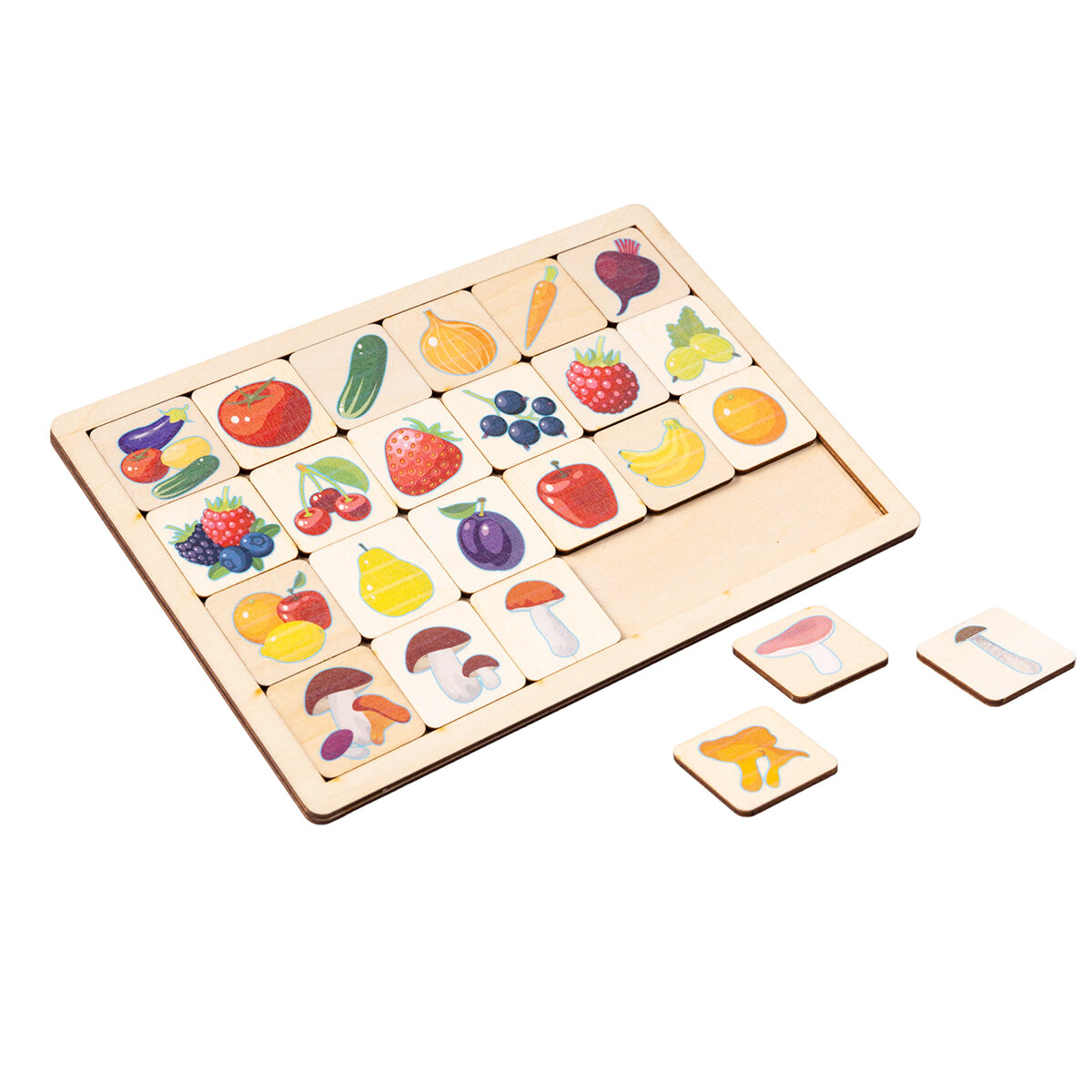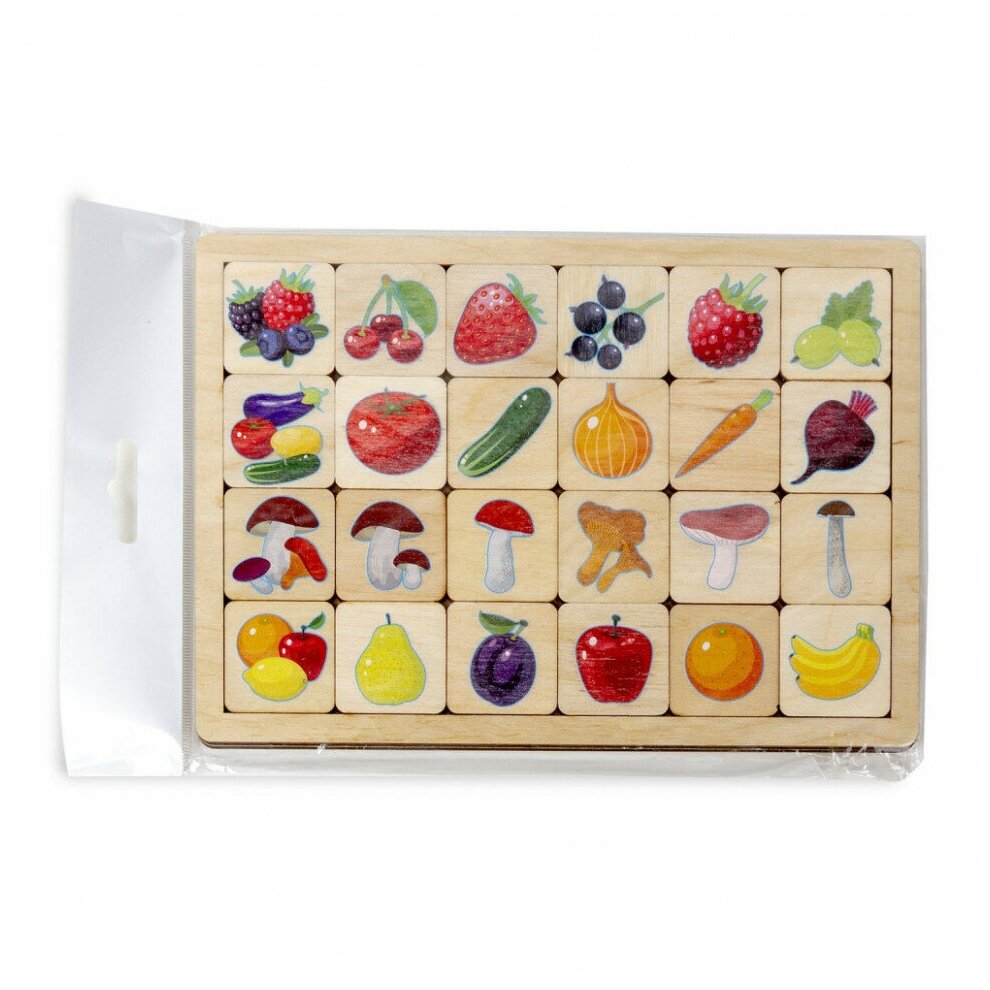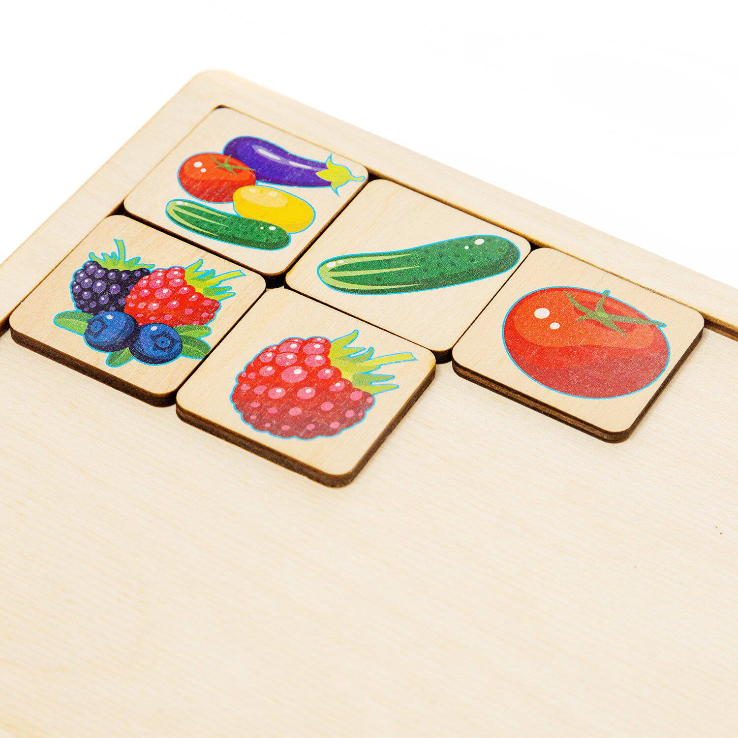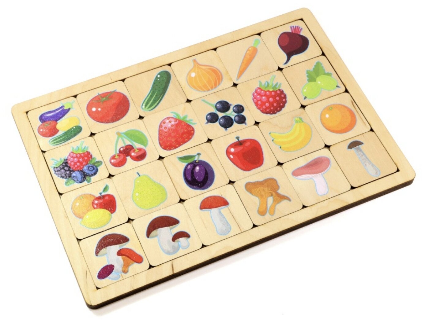 Собираем в рамке фишки с различными плодами. Можно группировать по цвету, вкусу, местам произрастания. И еще много групп – все зависит от вашей фантазии. Попутно развивается мелкая моторика рук, логическое мышление, зрительное восприятие, усидчивость.Игра развивающая из дерева «Овощи-Фрукты-Ягоды-Грибы» сделана по пазловому принципу.На игровом поле 228х152 мм ограниченного рамкой толщиной 4 мм размещаются фишки в 4 ряда, по 6 штук в ряд. Причем, каждый ряд нужно начинать с фишки, в соответствии с поставленной ребенку задачи. Например, сгруппировать фишки по виду плодов (овощи, фрукты, ягоды и грибы) или по цвету, по местам произрастания и т.п.Участие взрослых в игре обязательно. Пусть малыш объясняет по какому принципу он размещает фишки с признаками. Вы всегда можете поправить его, объяснив в чем его ошибка.Состав игры:планшет, размер 248х172х8 мм,фишки 24 шт, размер 38х38х4 мм.Все детали игры выполнены из сертифицированной фанеры при помощи лазера, не имеют заусенцев и зазубрин. Картинки на фишках нанесены безопасными красками на водной основе, поэтому безопасны для детей.Предупреждение!1. Не давать детям младше 3 лет.2. Не хранить вблизи нагревательных приборов.3. Не играть вблизи открытого огня.4. Из-за наличия мелких деталей контроль со стороны взрослых обязателен.