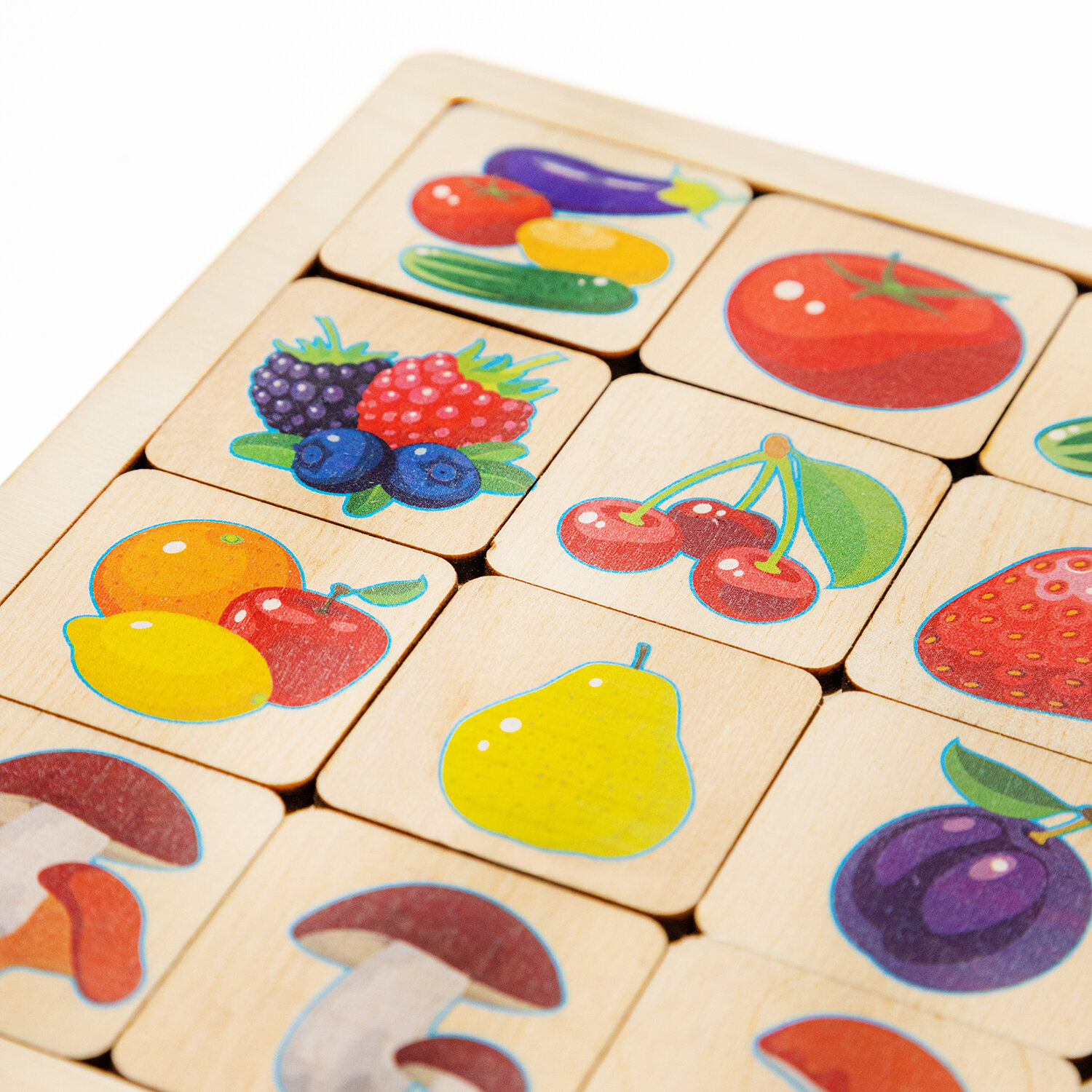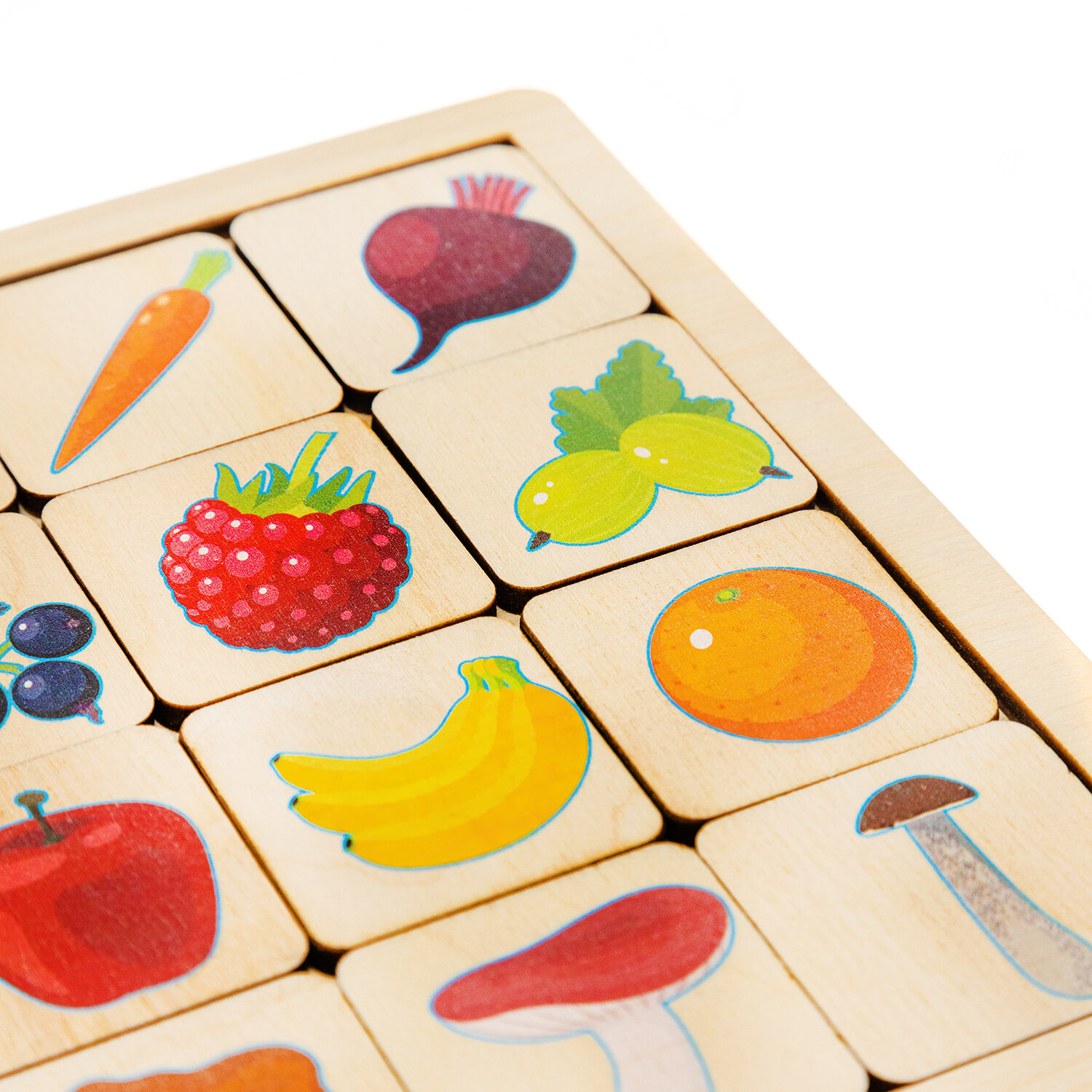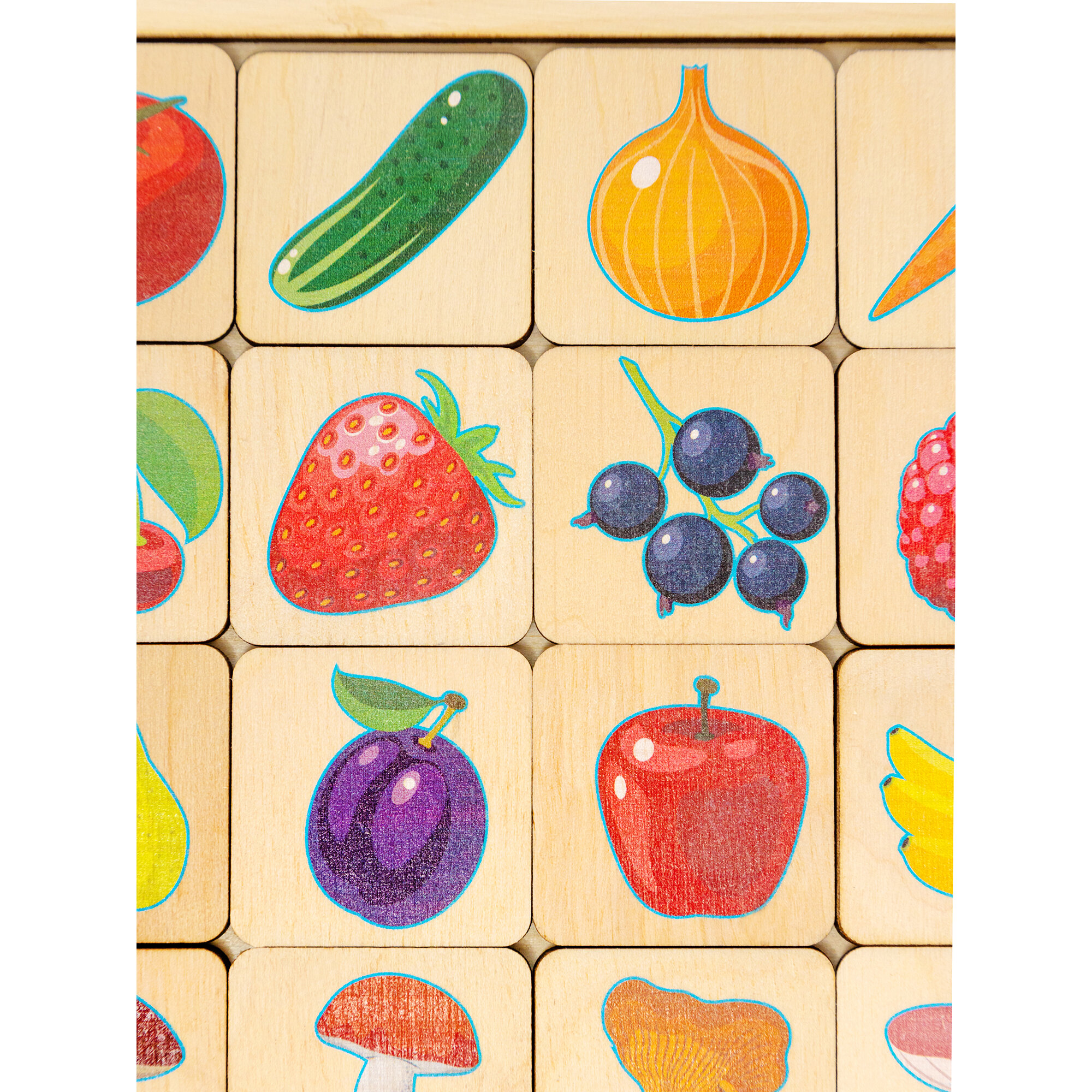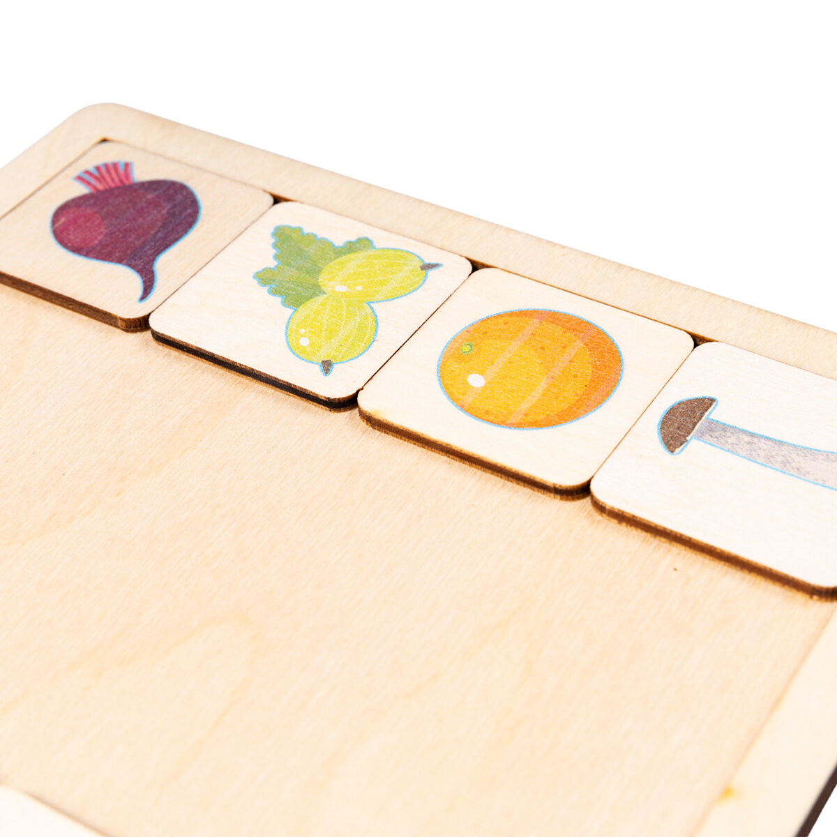 Собираем в рамке фишки с различными плодами. Можно группировать по цвету, вкусу, местам произрастания. И еще много групп – все зависит от вашей фантазии. Попутно развивается мелкая моторика рук, логическое мышление, зрительное восприятие, усидчивость.Игра развивающая из дерева «Овощи-Фрукты-Ягоды-Грибы» сделана по пазловому принципу.На игровом поле 228х152 мм ограниченного рамкой толщиной 4 мм размещаются фишки в 4 ряда, по 6 штук в ряд. Причем, каждый ряд нужно начинать с фишки, в соответствии с поставленной ребенку задачи. Например, сгруппировать фишки по виду плодов (овощи, фрукты, ягоды и грибы) или по цвету, по местам произрастания и т.п.Участие взрослых в игре обязательно. Пусть малыш объясняет по какому принципу он размещает фишки с признаками. Вы всегда можете поправить его, объяснив в чем его ошибка.Состав игры:планшет, размер 248х172х8 мм,фишки 24 шт, размер 38х38х4 мм.Все детали игры выполнены из сертифицированной фанеры при помощи лазера, не имеют заусенцев и зазубрин. Картинки на фишках нанесены безопасными красками на водной основе, поэтому безопасны для детей.Предупреждение!1. Не давать детям младше 3 лет.2. Не хранить вблизи нагревательных приборов.3. Не играть вблизи открытого огня.4. Из-за наличия мелких деталей контроль со стороны взрослых обязателен.