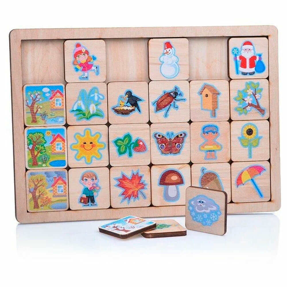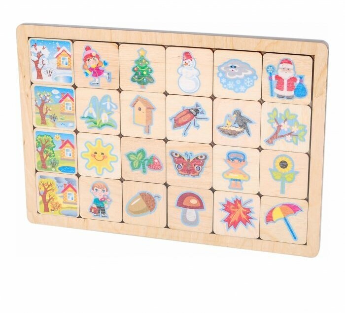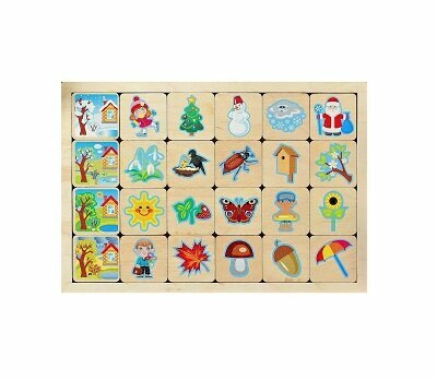 Выстраиваем фишки в ряд – обобщаем. Узнаем, что происходит в разное время года. Попутно развивается мелкая моторика рук, логическое мышление, зрительное восприятие, усидчивость.Игра развивающая из дерева «Времена года» сделана по пазловому принципу.На игровом поле 228х152 мм ограниченного рамкой толщиной 4 мм размещаются фишки в 4 ряда, по 6 штук в ряд. Причем, каждый ряд нужно начинать с фишки, на которой изображены времена года (зима, весна, лето и осень). Ребенок должен продолжить ряд, выложив фишки с признаками, соответствующими тому или иному времени года.Участие взрослых в игре обязательно. Пусть малыш объясняет по какому принципу он размещает фишки с признаками. Вы всегда можете поправить его, объяснив в чем его ошибка.Состав игры:планшет, размер 248х172х8 мм,фишки 24 шт, размер 38х38х4 мм.Все детали игры выполнены из сертифицированной фанеры при помощи лазера, не имеют заусенцев и зазубрин. Картинки на фишках нанесены безопасными красками на водной основе, поэтому безопасны для детей.Предупреждение!1. Не давать детям младше 3 лет.2. Не хранить вблизи нагревательных приборов.3. Не играть вблизи открытого огня.4. Из-за наличия мелких деталей контроль со стороны взрослых обязателен.