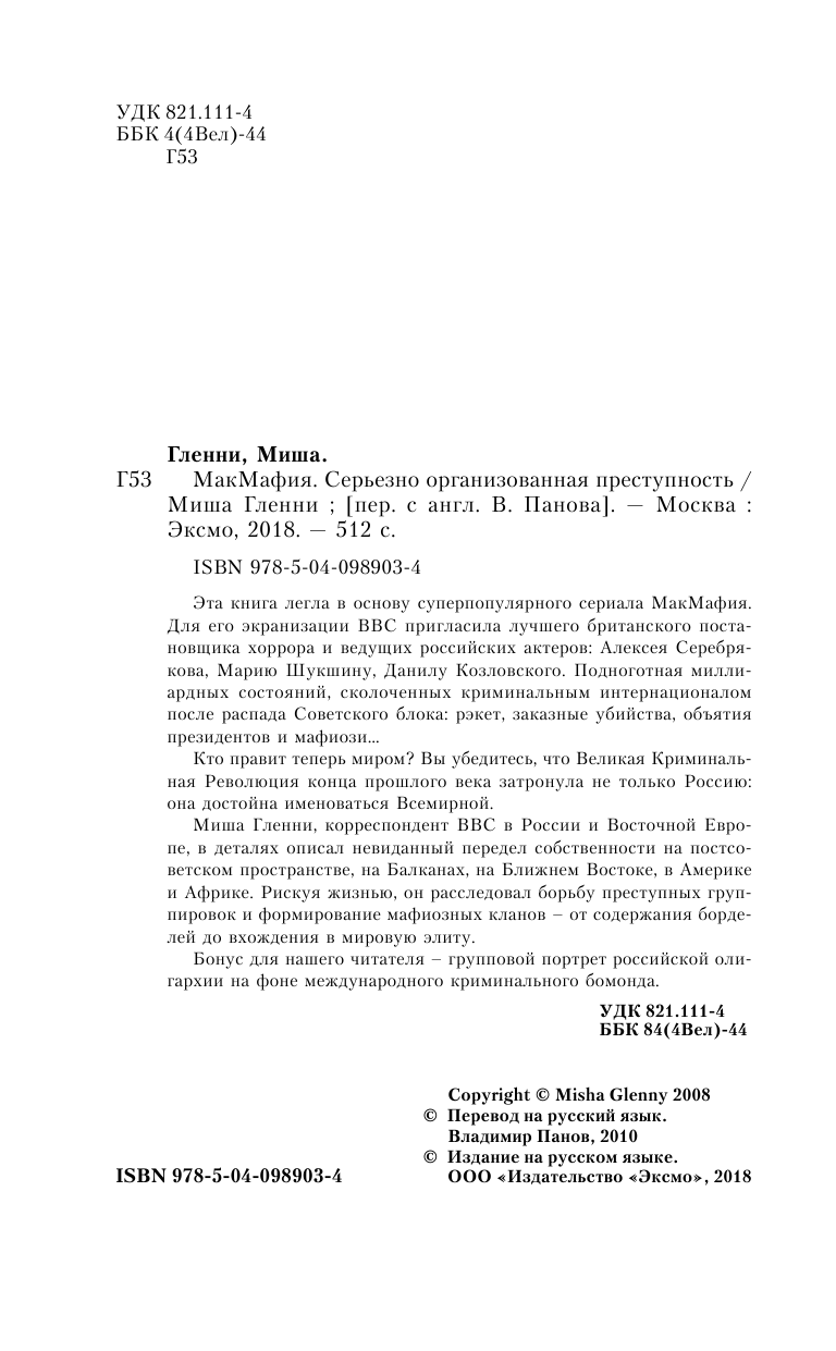 Эта книга легла в основу суперпопулярного сериала МакМафия. Для его экранизации BBC пригласила лучшего британского постановщика хоррора и ведущих российских актеров: Алексея Серебрякова, Данилу Козловского, Марию Шукшину. Подноготная миллиардных состояний, сколоченных криминальным интернационалом после распада Советского блока: рэкет, заказные убийства, объятия президентов и мафиози… Кто правит теперь миром? Вы убедитесь, что Великая Криминальная Революция конца прошлого века затронула не только Россию: она достойна именоваться Всемирной. Миша Гленни, корреспондент BBC в России и Восточной Европе, в деталях описал невиданный передел собственности на постсоветском пространстве, на Балканах, на Ближнем Востоке, в Америке и Африке. Рискуя жизнью, он расследовал борьбу преступных группировок и формирование мафиозных кланов - от содержания борделей до вхождения в мировую элиту. Бонус для нашего читателя - групповой портрет российской олигархии на фоне международного криминального бомонда.