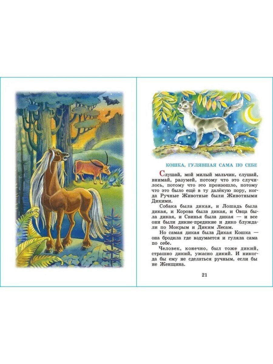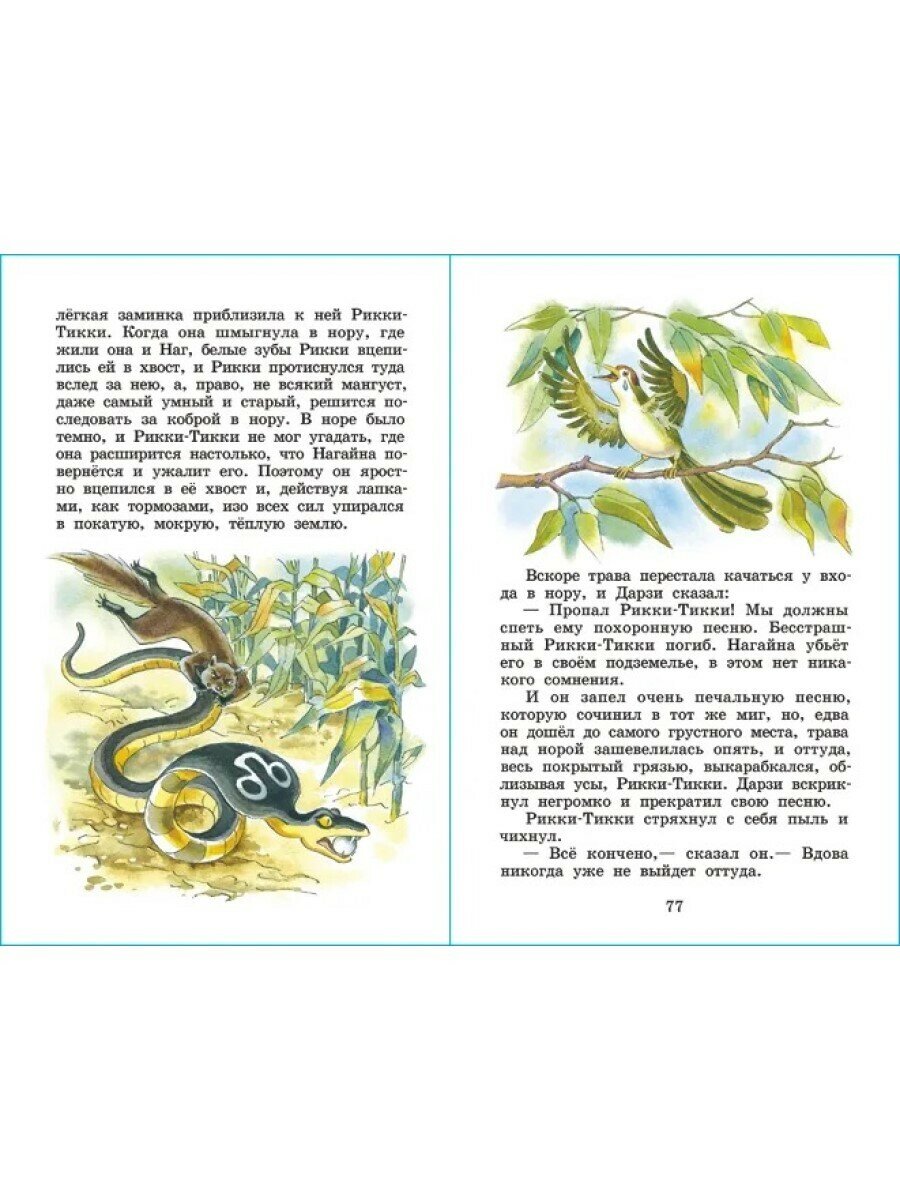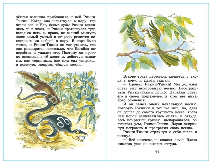 Искала "Рикки-Тикки-Тави" в переводе именно К. Чуковского и с хорошими иллюстрациями. В итоге остановилась на данном издании. Книга стандартного формата, с твердой обложкой и достаточно плотными листами. Текст набран крупным шрифтом, читается хорошо: и родителям будет легко и подойдет для первого чтения. Иллюстрации присутствуют почти на каждом развороте; не оторваны от текста; выполнены в спокойных тонах, все животные изображены реалистично. В сборник вошли также сказки "Слонёнок" ("Откуда у слонёнка длинный хобот") и "Кошка, которая гуляла сама по себе". Порадовало, что все сказки печатаются без сокращений и не в адаптированной малышовой версии.