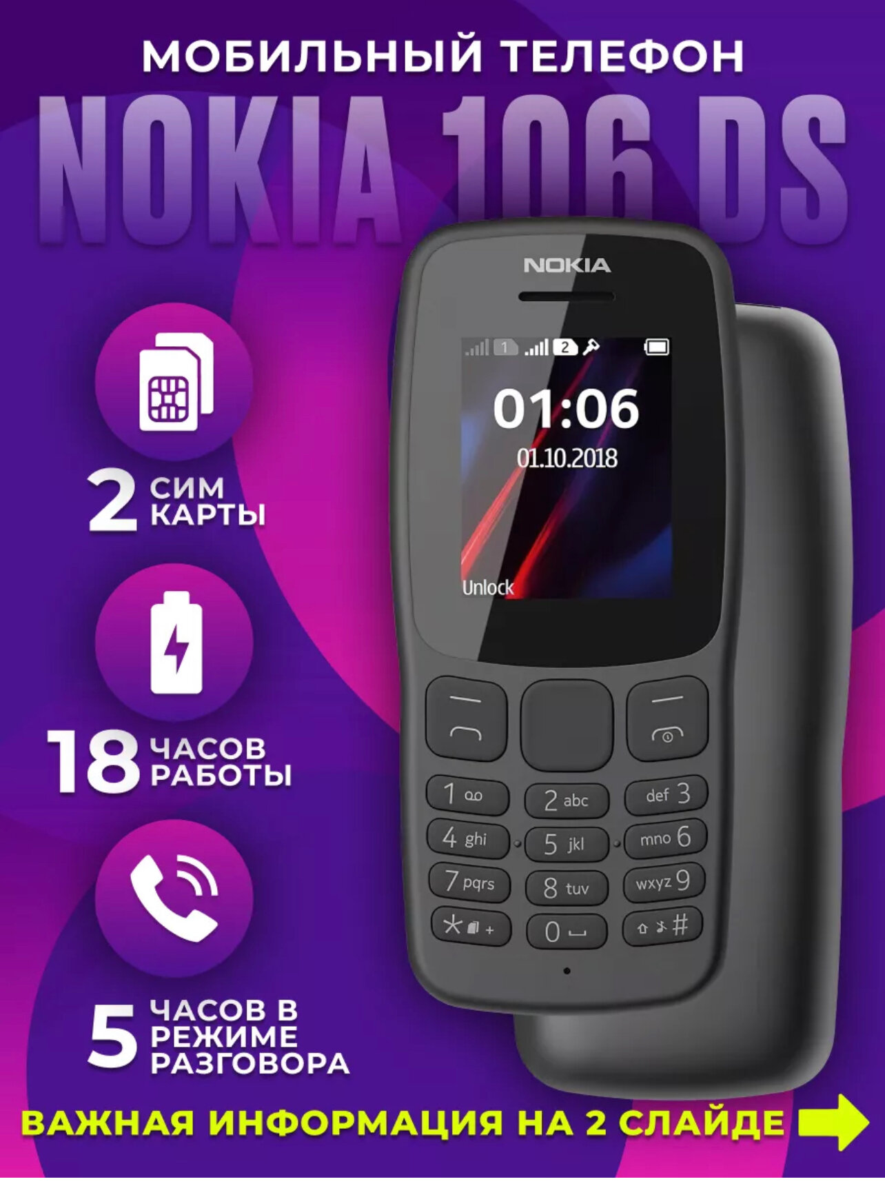 Nokia 106 — классический кнопочный телефон , классический дизайн максимально строгий. Корпус новинки - матовый пластик. Изолированные выпуклые кнопки позволяют комфортно вводить текст и цифры. Двухсимочный телефон, работающий в сетях GSM 900/1800. Он максимально прост в управлении и практичен в использовании.