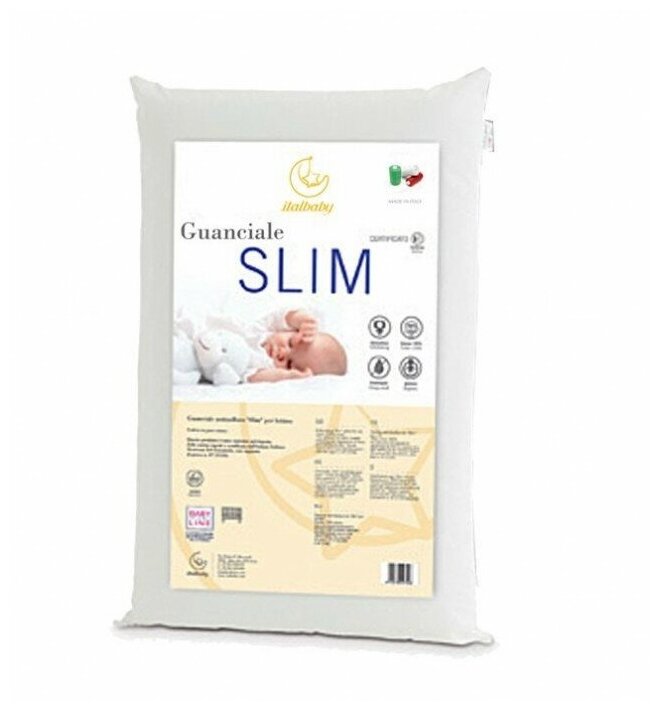 Наполнение подушки с уменьшенной толщиной Slim от Italbaby - термоизоляционные волокна полиэстера, позволяющие сохранять не только комфортную температуру, но и оптимальную поддержку головы спящего ребенка.