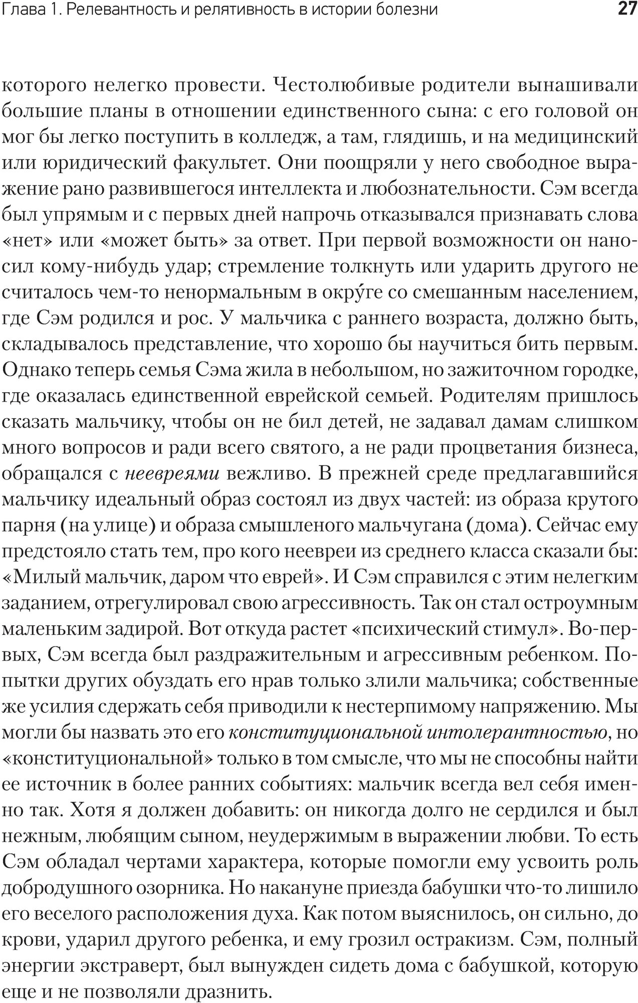 Автор дает читателю много наглядных примеров, описание лечения его клиентов. Он, конечно же, не прописывает в книге всю терапевтическую историю болезни, однако дает понять самое главное. Кроме того под психоанализ были взяты биографии таких известных личностей, как Адольф Гитлер и Максим Горький.