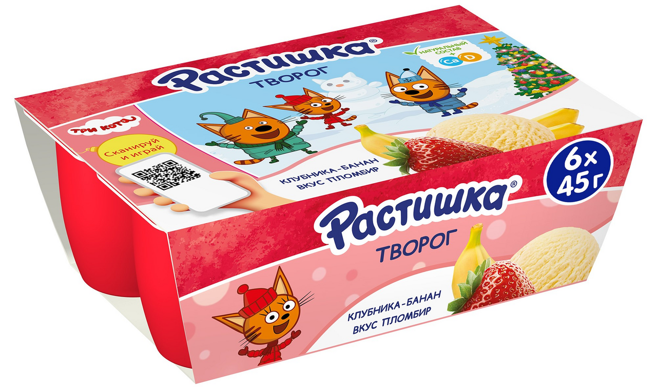 Творог детский Danone Растишка Клубника-банан и Пломбир 3.5% 6шт*45г - это полезное ассорти для питания детей с 3-летнего возраста (в комплект входит по 3 творожка каждого вкуса). Производится из обезжиренного молока и творожной закваски с добавлением ферментов, сливок, клубничного пюре и натурального ароматизатора. Продукт обогащен витамином D и кальцием, необходимыми для здорового роста и активного развития малыша. Он способствует формированию крепких костей и зубов, улучшает пищеварение. Забавная упаковка, стилизованная под вафельные стаканчики, и специальные палочки помогут вам сделать вкусное и полезное детское мороженое. Обратите внимание: перед введением нового продукта в рацион ребенка обязательно проконсультируйтесь с вашим педиатром!