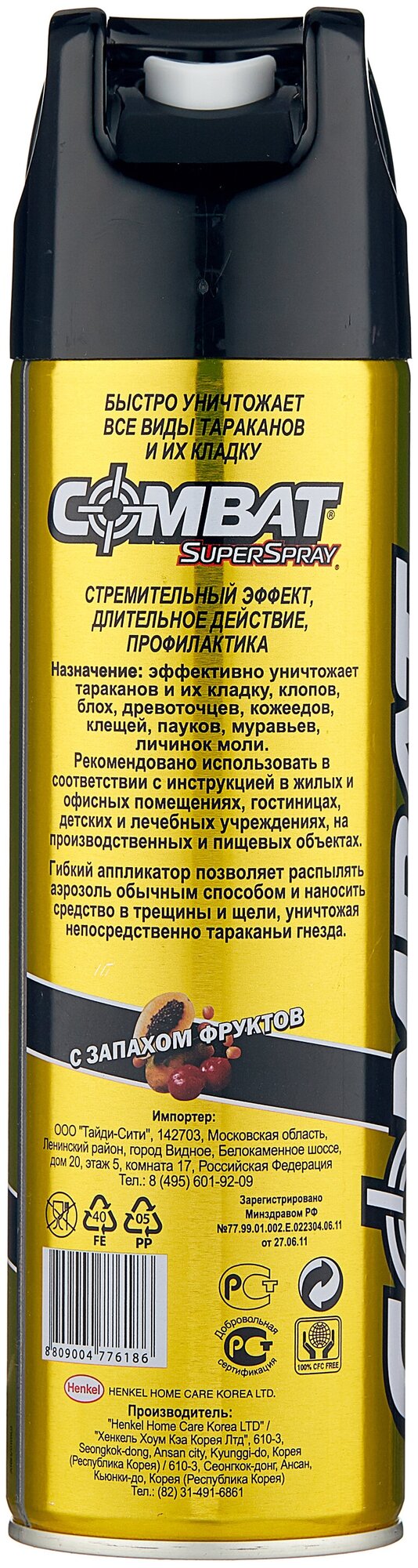 Описание товара:Аэрозоль Combat Super Spray эффективно уничтожает тараканов и их кладку, клопов, блох, древоточцев, кожеедов, клещей, пауков, муравьев, личинок моли. В состав средства входит имипротрин, обладающий исключительно быстрым действием, и цифенотрин, который вызывает высокую смертность насекомых, обладает остаточным действием и низкой токсичностью в отношении животных. Аэрозоль оснащен гибкой насадкой на распылителе, которая позволяет уничтожать насекомых даже в труднодоступных местах: в щелях вдоль плинтусов и за дверными коробками, в стенах и на кафеле. Кроме этого, использование насадки позволит вам аккуратно распылить средство, избегая попадания на обои, ткань или бытовую технику. Слабый и приятный запах, который быстро выветривается. Рекомендовано использовать в соответствии с инструкцией в жилых и офисных помещениях, гостиницах, детских и лечебных учреждениях, на производственных и пищевых объектах. Стремительный эффект, длительное действие, профилактика. Качество HENKEL.Состав товара:Имипротрин, цифенотрин, растворители, пропеллент, вода.Меры предосторожности:Хранить при комнатной температуре подальше отдельно от пищевых продуктов, в местах недоступных детям.