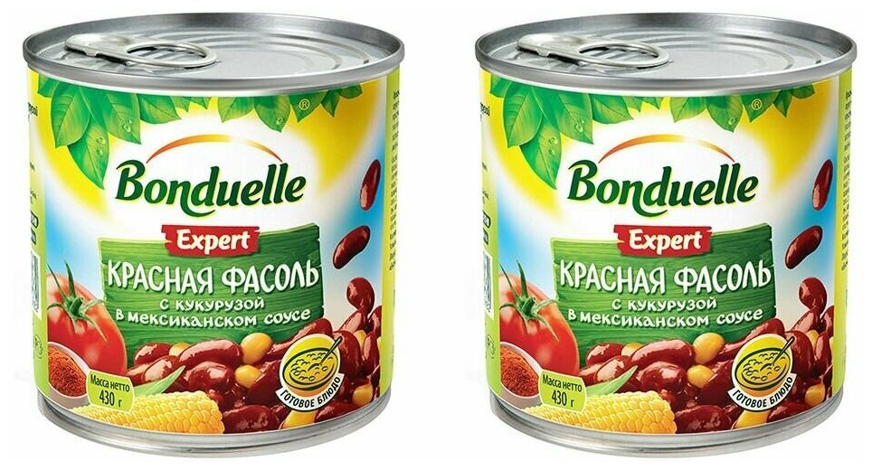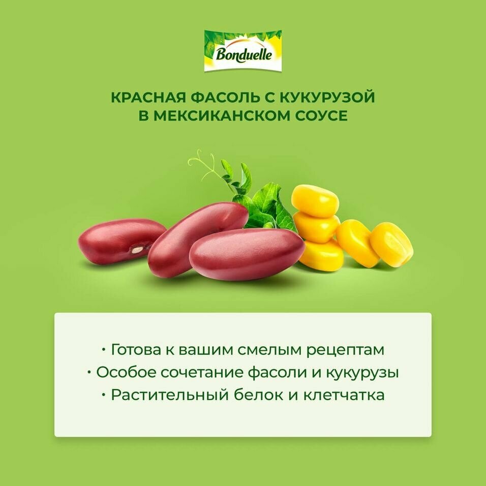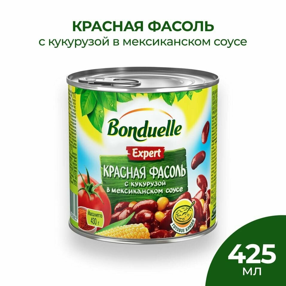 Фасоль Bonduelle Expert Красная с кукурузой в мексиканском соусе 430г перенесет вас в солнечную Мексику и наполнит ваши блюда ее пряными вкусами и ароматами. Оригинальная смесь из красной фасоли и сочной кукурузы в пикантном соусе с ароматными специями - это и самостоятельное блюдо, и великолепная основа для гарниров, супов, закусок и горячего. Подайте ее к жареным ребрышкам или мясу на гриле, сделайте буррито или кесадилью, томатный суп или овощное рагу. Продукт не содержит ГМО. Упакован в жестяную банку с ключом на крышке.