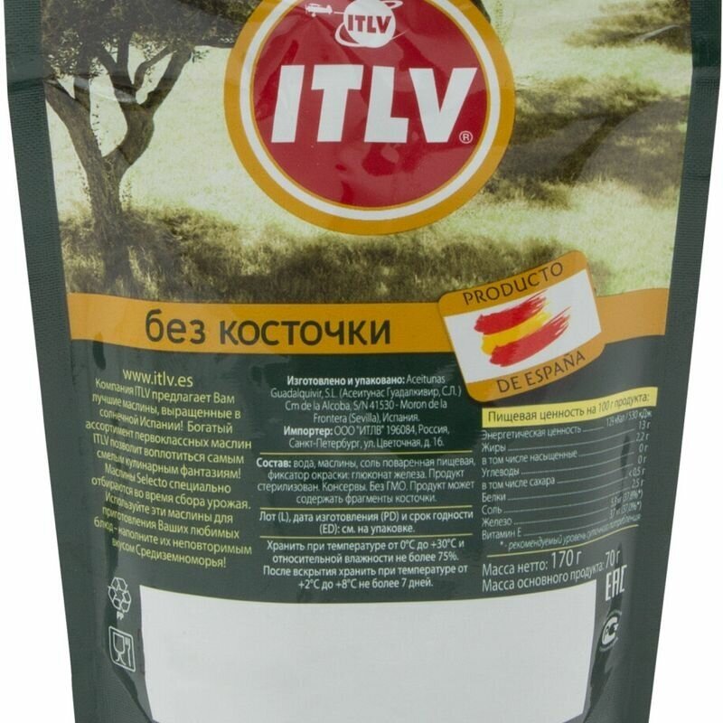 | Состав | Маслины, вода, соль поваренная пищевая, регуляторы кислотности - лимонная и молочная кислоты, антиокислитель аскорбиновая кислота, консервант Е202 сорбат калия. |