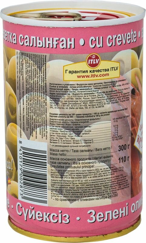 | Состав | Вода, оливки сорта Мансанилья, 6% пасты из креветок в основном продукте (вода, креветки 10%, загуститель – альгинат натрия), соль поваренная пищевая, усилитель вкуса и аромата – глутамат натрия, регулятор кислотности – лимонная и молочная кислота, антиокислитель – аскорбиновая кислота. |
