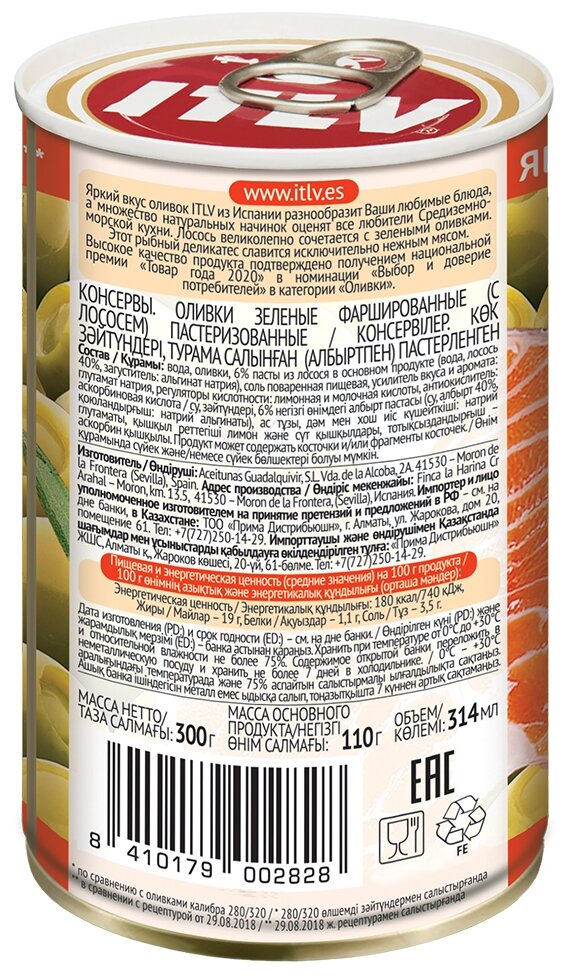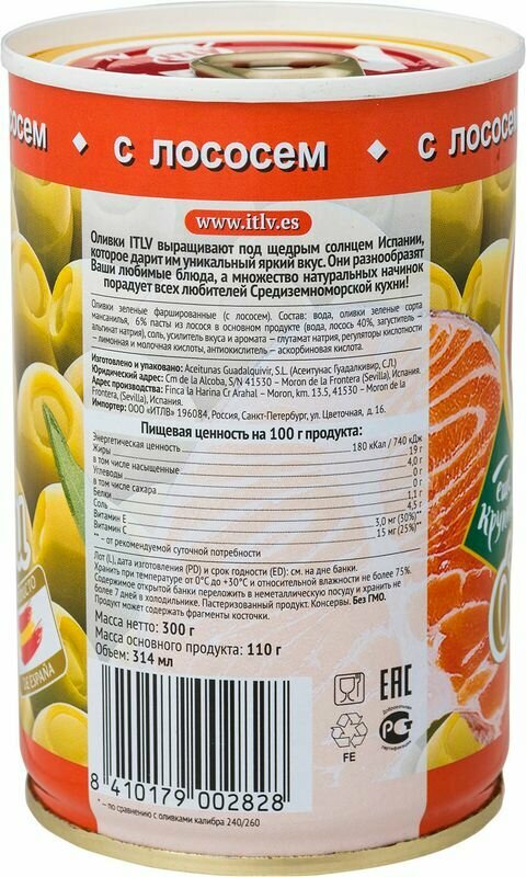 | Состав | Оливки сорта мансанилья, вода, 6% пасты из лосося в основном продукте (вода, лосось 40%, загуститель - альгинат натрия), соль поваренная пищевая, усилитель вкуса и аромата - глутамат натрия, регуляторы кислотности - лимонная и молочная кислоты, антиокислитель - аскорбиновая кислота. |