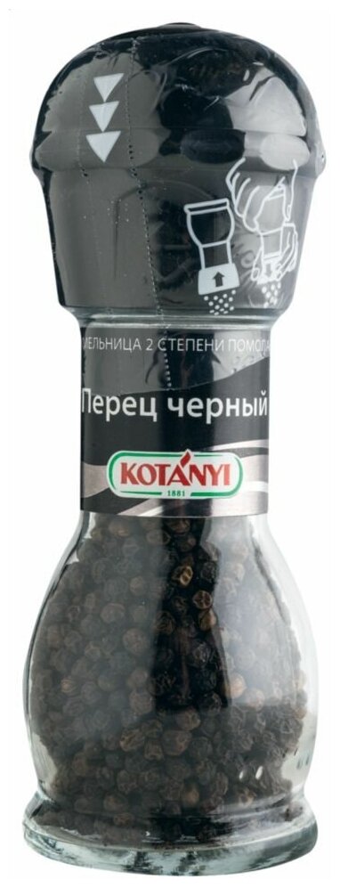 Специя Kotanyi Перец черный 36г - настоящий "король пряностей" от известного австрийского производителя. Он абсолютно универсален в применении, имеет пряный насыщенный аромат и в меру острый вкус. С такой удобной мельницей вы сможете по достоинству оценить все преимущества свежемолотого черного перца. Пластиковый механизм на крышке имеет две степени помола. Чтобы выбрать крупный, переверните мельницу и опустите механизм до щелчка. Чтобы использовать мелкий помол, поднимите механизм по стрелочкам. Подходит для сервировки стола.