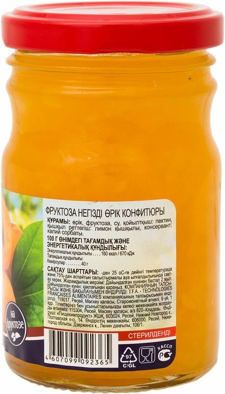 | Состав | Абрикос, фруктоза, регулятор кислотности - лимонная кислота, загуститель - пектин, вода, консервант - сорбат калия. |