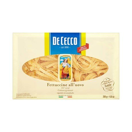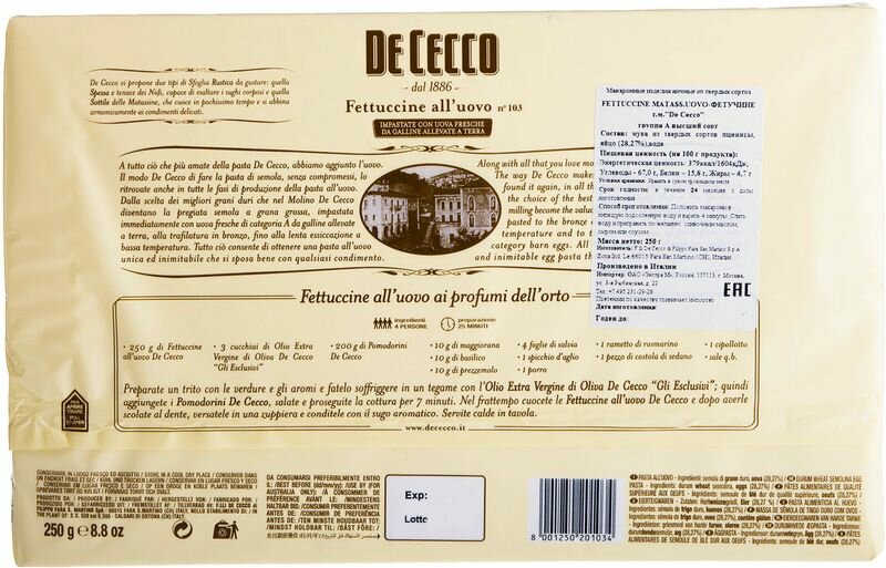 Макароны De Cecco Fettuccine all'uovo n.103 250г - длинные макаронные изделия с яйцом, популярные по всей Италии. Имеют плоское сечение толщиной 0.9-7.1мм. Отлично сочетаются с мясными и томатными соусами, с морепродуктами, моллюсками, сливочными соусами и мягким сыром. Для изготовления фирменной пасты De Cecco используется оригинальная рецептура Филлипо де Чекко, крупка Semola, родниковая вода из источника в национальном парке Майелла, свежие охлажденные яйца, бронзовые формочки и старинная технология сушки. Именно поэтому паста De Cecco всегда получается упругая, с хорошей текстурой, сохраняет форму при варке и получается al dente.
