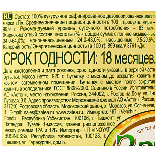 | Состав | 100% кукурузное рафинированное дезодорированное вымороженное масло марки "п" |