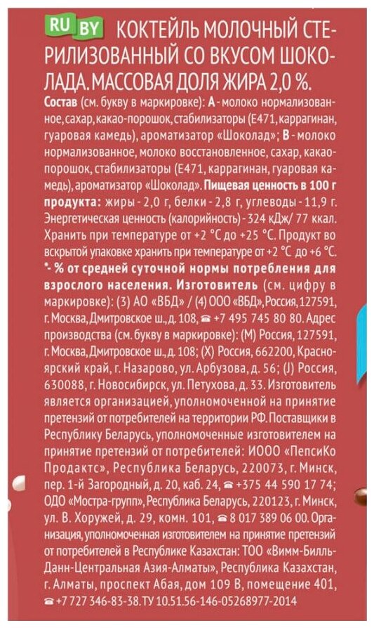 | Состав | молоко цельное; вода; сахар; молоко обезжиренное; молоко сухое обезжиренное; стабилизаторы-каррагинан; гуаровая камедь; какао-порошок; моно- и диглицериды жирных кислот |