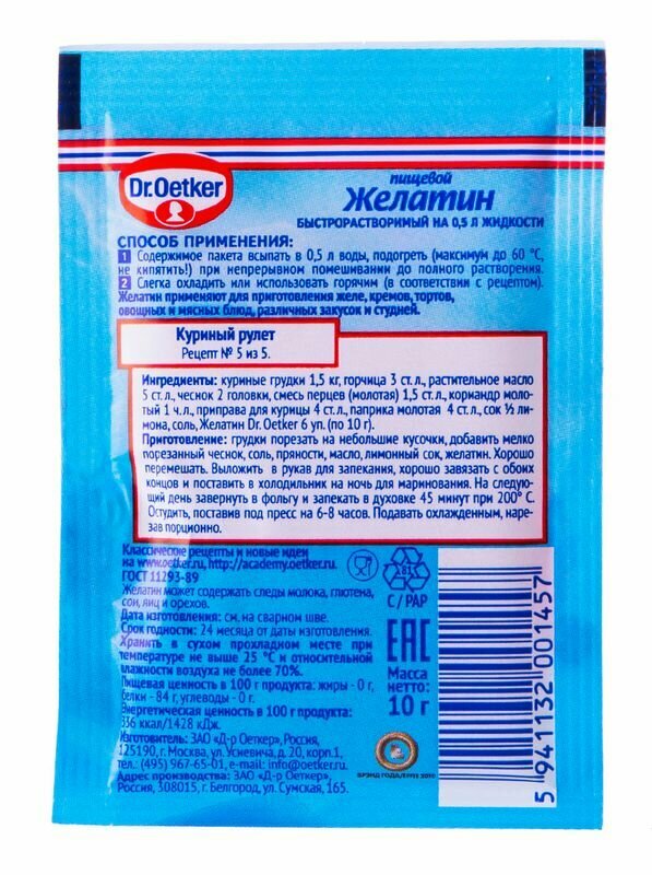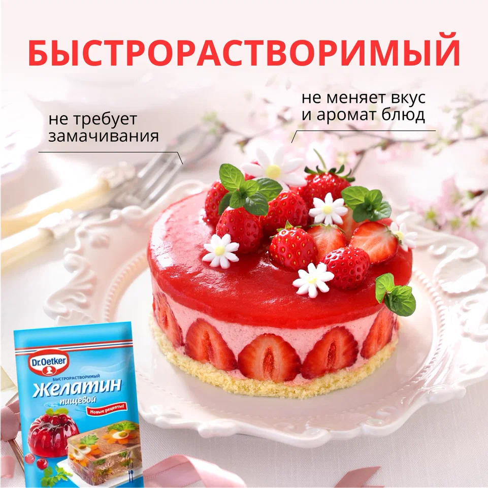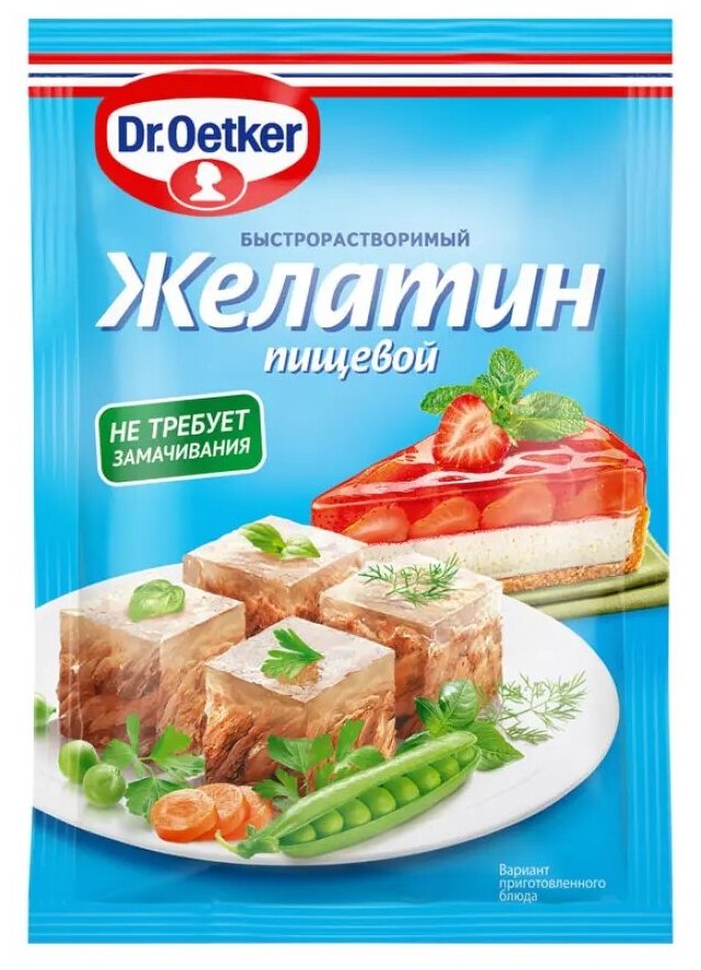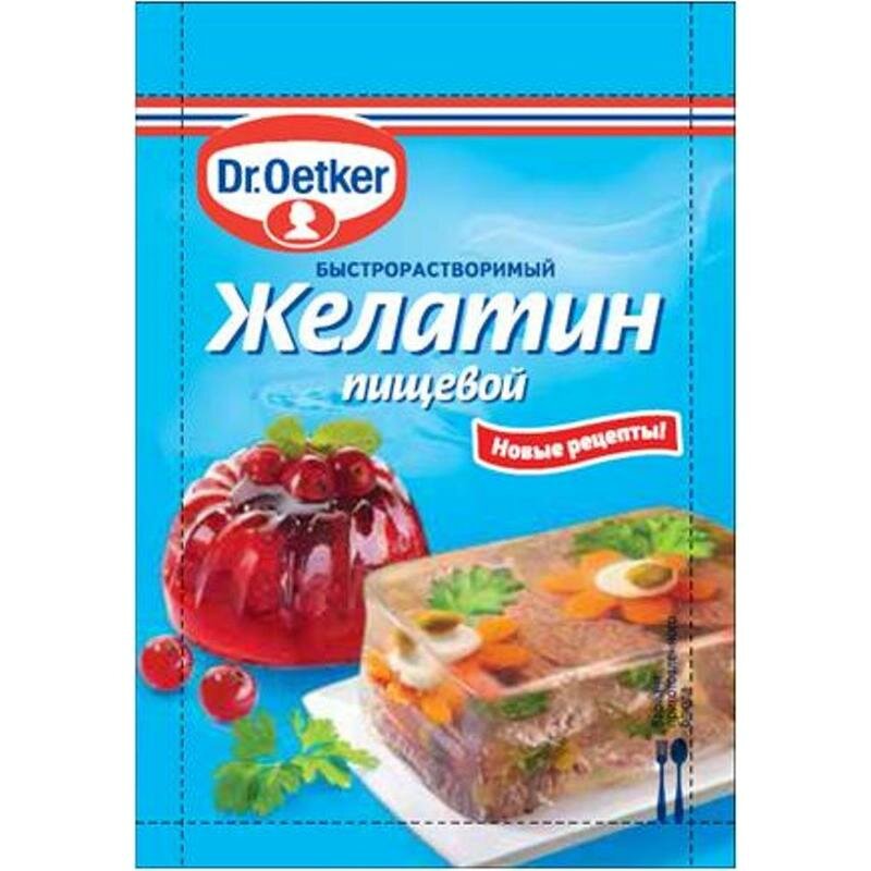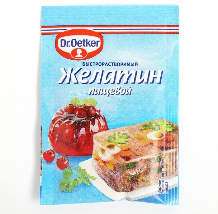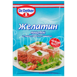Описание товара:Несомненным преимуществом Желатина Dr. Oetker является то, что он не требует предварительного замачивания и отлично растворяется: нужно просто смешать его с жидкостью и немного подогреть. Кроме того, желатин Dr. Oetker обладает прекрасными желирующими свойствами. Студни, холодцы и десерты застывают быстро и прекрасно держат форму.Состав товара:Желатин пищевой быстрорастворимый.Способ приготовления:Содержимое пакета высыпать в 1,5 литра воды и подогреть (максимум до 60 градусов, не кипятить!) при непрерывном помешивании до полного растворения. Слегка охладить или использовать горячим (в соответствии с рецептом).Меры предосторожности:Хранить в сухом прохладном месте при относительной влажности воздуха не более 70%. Может содержать следы молока, глютена, сои, яиц, кунжута и орехов. Не применять со свежими киви и ананасами!