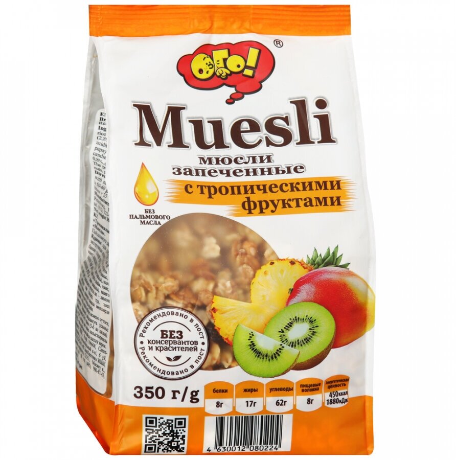 Завтрак - очень важный прием пищи, который не стоит пропускать! Именно он наполняет организм энергией и создает настроение на предстоящий день. Мюсли Ого Запеченные с тропическими фруктами 350г - это грамотный выбор для тех, кто следит за своим питанием и здоровьем. Они приготовлены из овсяных и пшеничных хлопьев с добавлением изюма, вяленых бананов, цукатов ананаса, папайи и манго. Чтобы приготовить полноценное блюдо, вам потребуются считанные мгновенья. Насыпьте смесь в тарелку, залейте по вкусу молоком, кефиром, йогуртом или соком, дайте настояться 2-3 минуты - и можно есть!