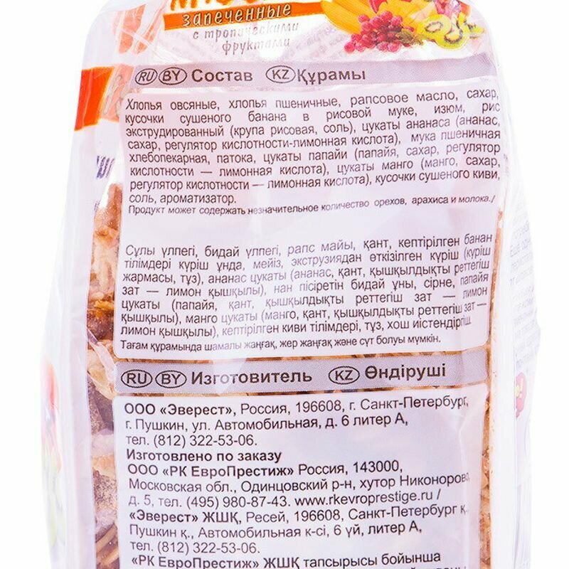 | Состав товара | Хлопья овсяные, хлопья пшеничные, олеин пальмовый, сахар, кусочки вяленого банана в рисовой муке, изюм, рис экструдированный (крупа рисовая, соль), цукаты ананаса, (ананас,сахар), мука пшеничная, патока, цукаты папайи (папайя, сахар), цукаты манго (манго, сахар, краситель пищевой желтый "солнечный закат"), цукаты киви (киви,сахар), соль, ароматизаторы (ананас, апельсин). Продукт может содержать незначительное количество орехов, арахиса,молока и диоксида серы. ТУ 9196-003-09645951-2012 |
