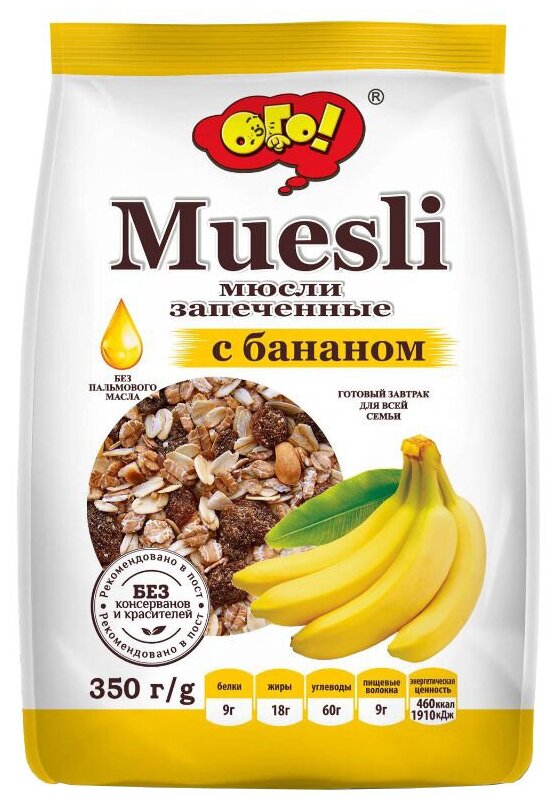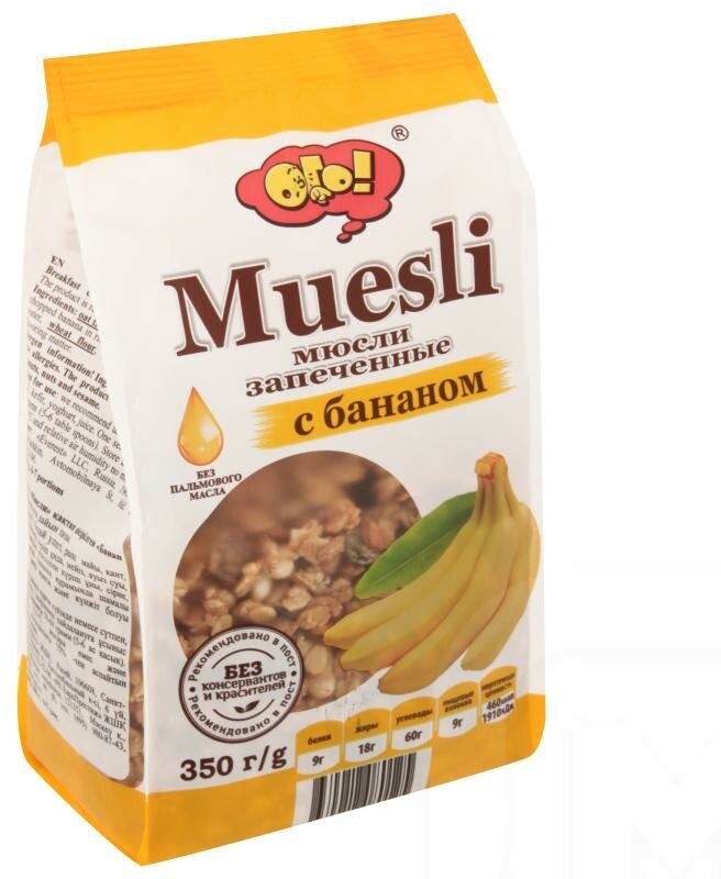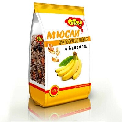 Завтрак - очень важный прием пищи, который не стоит пропускать! Именно он наполняет организм энергией и создает настроение на предстоящий день. Мюсли Ого Запеченные с бананом 350г - это грамотный выбор для тех, кто следит за своим питанием и здоровьем. Они приготовлены из овсяных и пшеничных хлопьев с добавлением кусочков вяленого банана и изюма. Чтобы приготовить полноценное блюдо, вам потребуются считанные мгновенья. Насыпьте смесь в тарелку, залейте по вкусу молоком, кефиром, йогуртом или соком, дайте настояться 2-3 минуты - и можно есть!