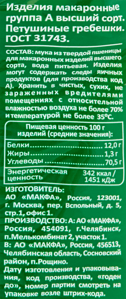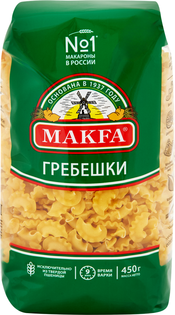 Макароны Makfa Петушиные гребешки 450г производятся по классическому рецепту из крупки твердых сортов пшеницы (дурум) и чистой воды. При варке они сохраняют не только свою форму, но и полезные свойства зерна. Полые волнистые гребешки - это короткий формат пасты. Они прекрасно удерживают внутри и на поверхности нежные сливочные соусы. Подходят для приготовления супов, салатов и запеканок. Чтобы получить правильную текстуру al dente, такие макароны следует варить в кипящей подсоленной воде в течение 7-12 минут. Продукт не содержит ГМО и соответствует стандартам ГОСТ.