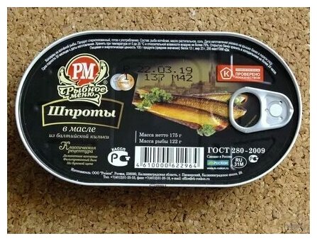 Описание товара:Консервы из копченой рыбы Шпроты в масле из балтийской кильки Рыбное меню 175 г. Классическая рецептура. Деликатное копчение. Фильтрованный дым. На буковой щепе. ГОСТ 280-2009.Состав товара:Рыба копченая, масло растительное, соль.Способ приготовления:Продукт стерилизованный.Меры предосторожности:Хранить при относительной влажности воздуха не более 75%. Открытую банку хранить в холодильнике не более 24 часов.