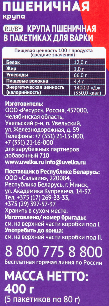 Сервис сравнения цен СкидкаГИД предлагает сравнить цены на товар «Крупа Увелка Пшеничная 5пак*80г РЕСУРС»