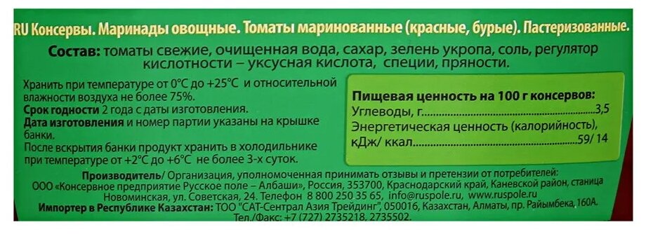 | Производитель | ООО "Консервное предприятие Русское поле - Албаши" |