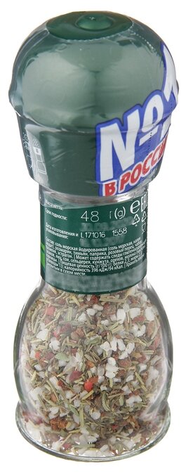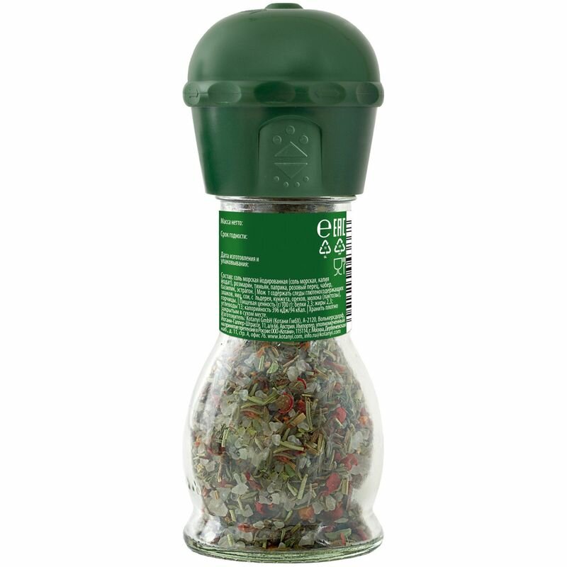 | Состав товара | Соль поваренная пищевая морская йодированная, розмарин, тимьян, паприка, розовый перец, чабер, базелик, эстрагон. |