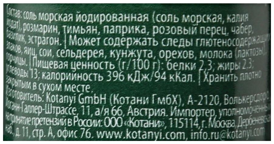 | Состав | Соль поваренная пищевая морская йодированная, розмарин, тимьян, паприка, розовый перец, чабер, базилик, эстрагон. |
