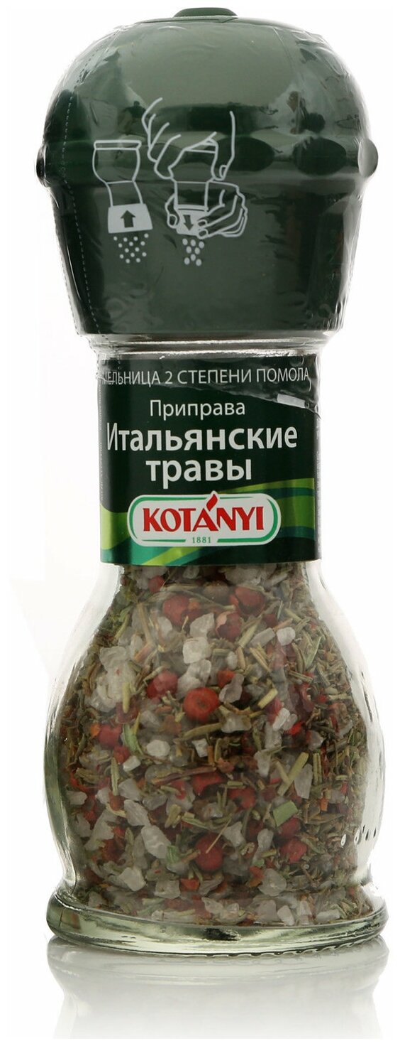 Приправа Kotanyi Итальянские травы 48г - это смесь крупной морской йодированной соли с ароматными травами Средиземноморья. В нее вошли терпкий розмарин, пряный тимьян, паприка, умеренно острый розовый перец, чабер, душистый базилик и эстрагон. Эта приправа отлично сочетается с печеными и свежими овощами, мясом, птицей, рыбой и салатами. Удобная мельница позволит вам по достоинству оценить все преимущества свежемолотых специй. Пластиковый механизм на крышке имеет две степени помола. Чтобы выбрать крупный, переверните мельницу и опустите механизм до щелчка. Чтобы использовать мелкий помол, поднимите механизм по стрелочкам. Подходит для сервировки стола.