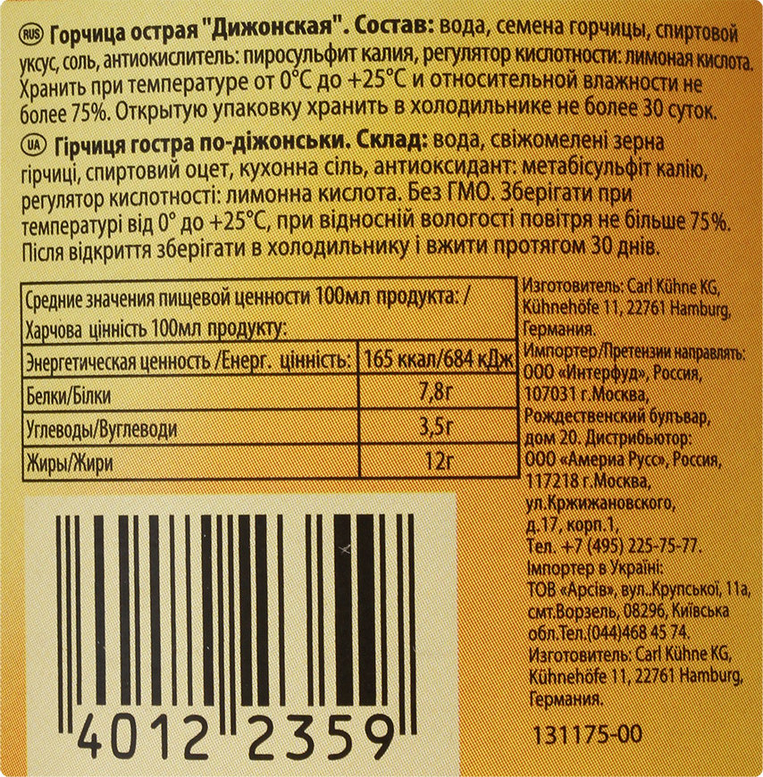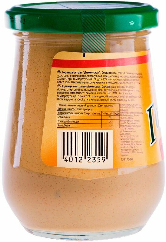 Горчица Kuhne Дижонская острая 250мл - это пикантная приправа, созданная на базе традиционного французского рецепта из мелко перемолотых горчичных семян. Имеет нежную сливочно-кремовую консистенцию и обжигающий вкус. Отлично дополняет любые блюда из мяса и птицы, а также мясные полуфабрикаты, используется для приготовления маринадов и соусов. Продукт не содержит ГМО, глютен, лактозу, искусственные красители, подходит для вегетарианцев. Расфасован в стеклянную баночку оригинальной формы с герметично закрученной крышкой.